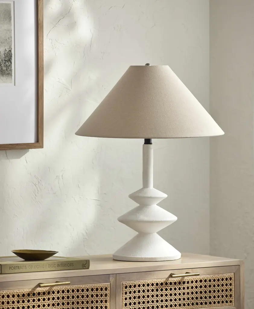 Collection: Valderice Colors: Ivory, Black, Metallic Gold, Translucent, Off White, Snow White Material: Body: Resin / Shade (Outside): Linen / Shade (Inside): Plastic / Finial: Iron Styles: Transitional,Bohemian Made In: China Lighting Type: Accent Table Lighting Shade Material: Linen, Plastic Shade Color: White, Ivory Cord Length: 6' Switch Type: Rotary Number of Bulbs: 1 Socket Type: E-26 Bulb Wattage: 60W