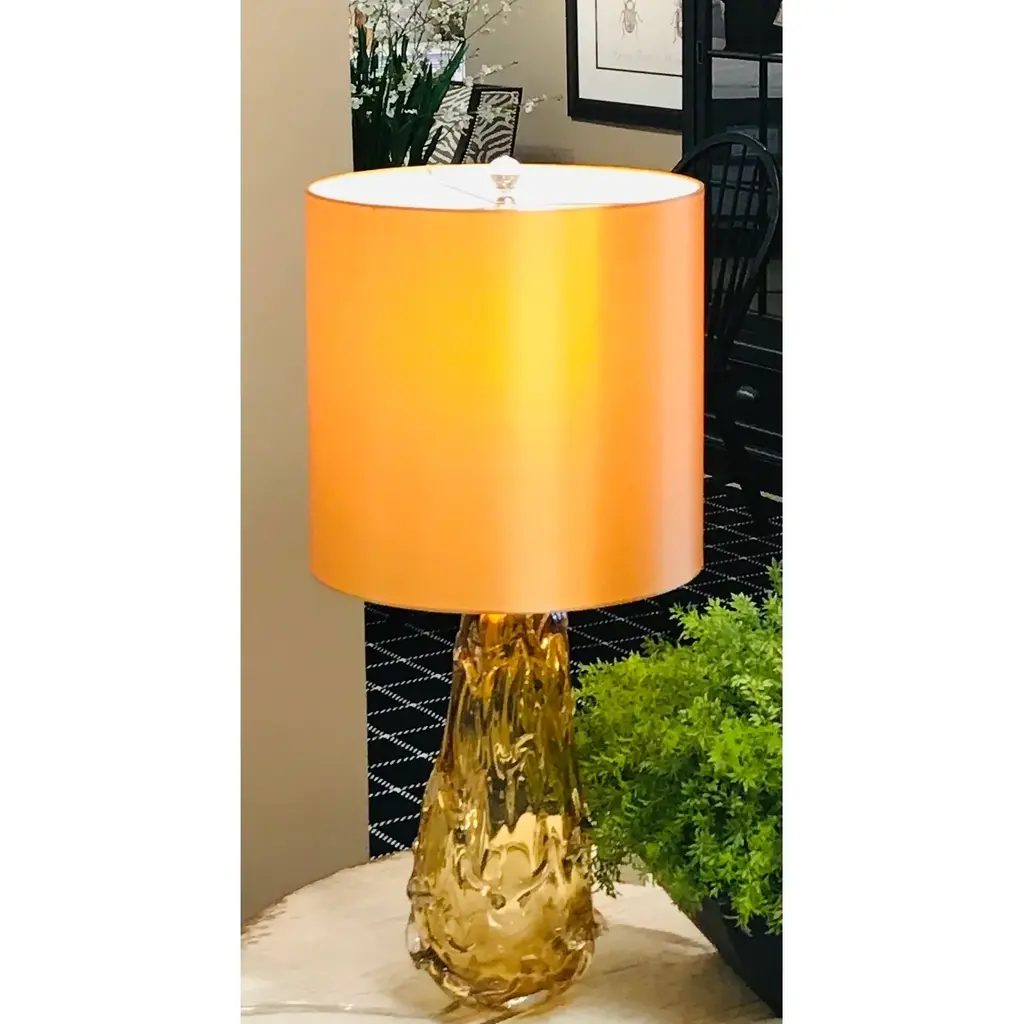 Lucas + McKean's newest glass table lamp, the Valencia shows off our historical design inspiration with the use of a traditional French Wire design, and the glamourous shape and color. More than just functional for your modern home, this orange and amber table lamp lends artful appeal to your space as it shines. Try adding one to your entryway to add warmth as your guests arrive or in the nursery suite for a mini makeover. Crafted from a circular, translucent glass base showing the pulled and sculpted effect, it's topped off with an empire shade in a matching hue for a finished look.