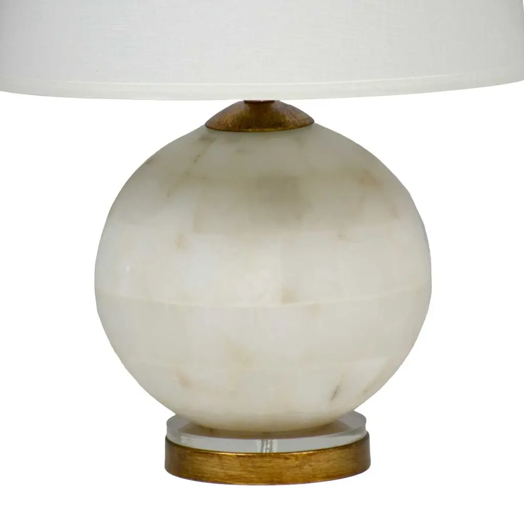 This impressive orb of tiled alabaster gleams with luster sitting atop a dual base of acrylic and gold. The globe silhouette of the Valencia Table Lamp makes it a glamorous transitional accent piece. Alabaster is a natural material. Differences in color and pattern should be expected and celebrated.