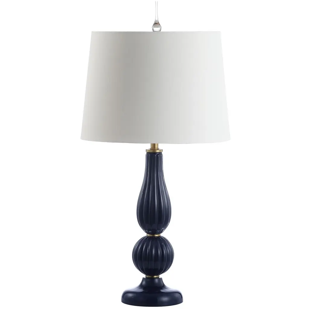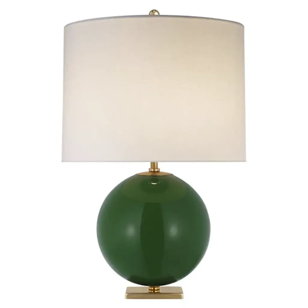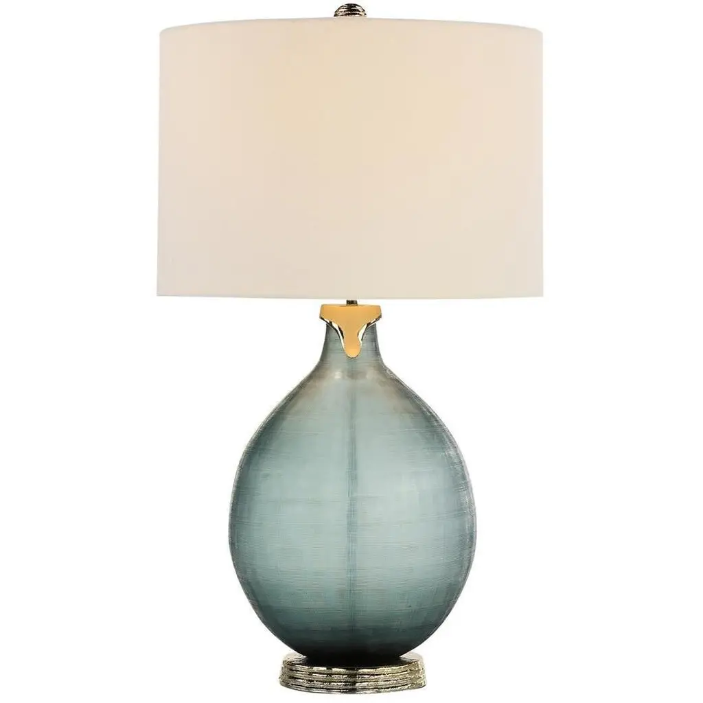 The Valentina Table Lamp is a stunning home accent, infusing elegant tones to an interior space. Crafted from glass with a dark green tone, the body showcases a striated look contributing subtle depth. An ornate brass band in an Antiqued finish lines the bottom, embellished with green gemstones and with mother of pearl. A rounded brass base features an acrylic disc, matching the neck accent and ball finial to complete the look.