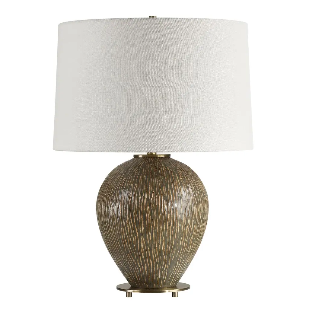 The Valentino Table Lamp is a stunning piece that brings a touch of nature indoors. Its ceramic base, with a rich, distressed finish, exudes an organic texture that captures an earthy essence. This is beautifully enhanced by the elegant plated antique brass accents, adding a hint of sophistication. The lamp is topped with a slightly tapered round hardback shade, crafted from casual white linen fabric, which diffuses light softly, creating a warm and inviting ambiance. Perfect for any space, the Valentino Table Lamp is a harmonious blend of rustic charm and refined elegance.