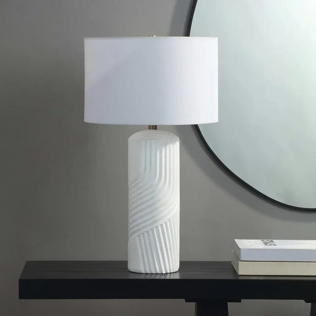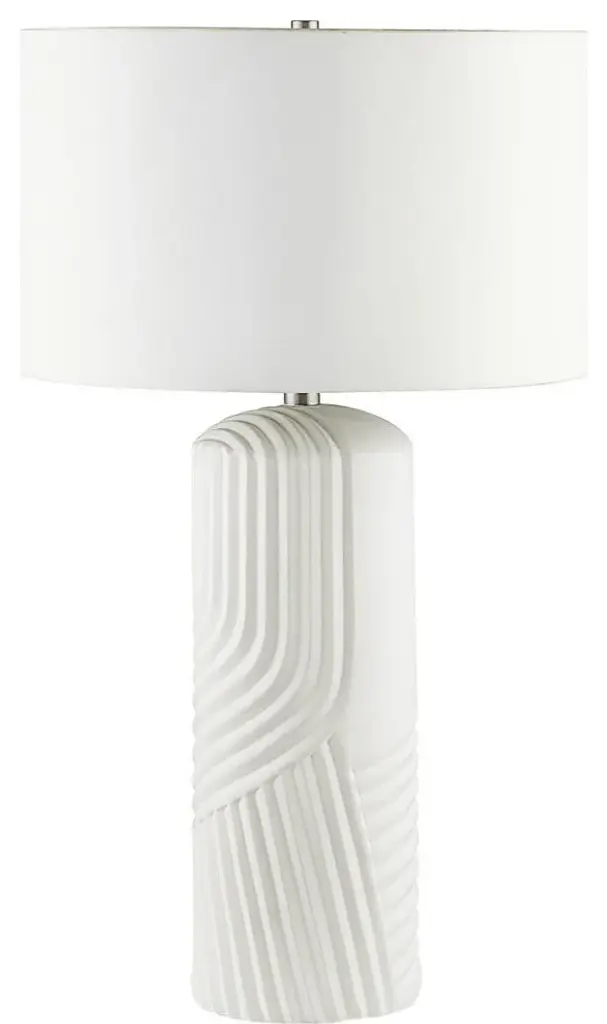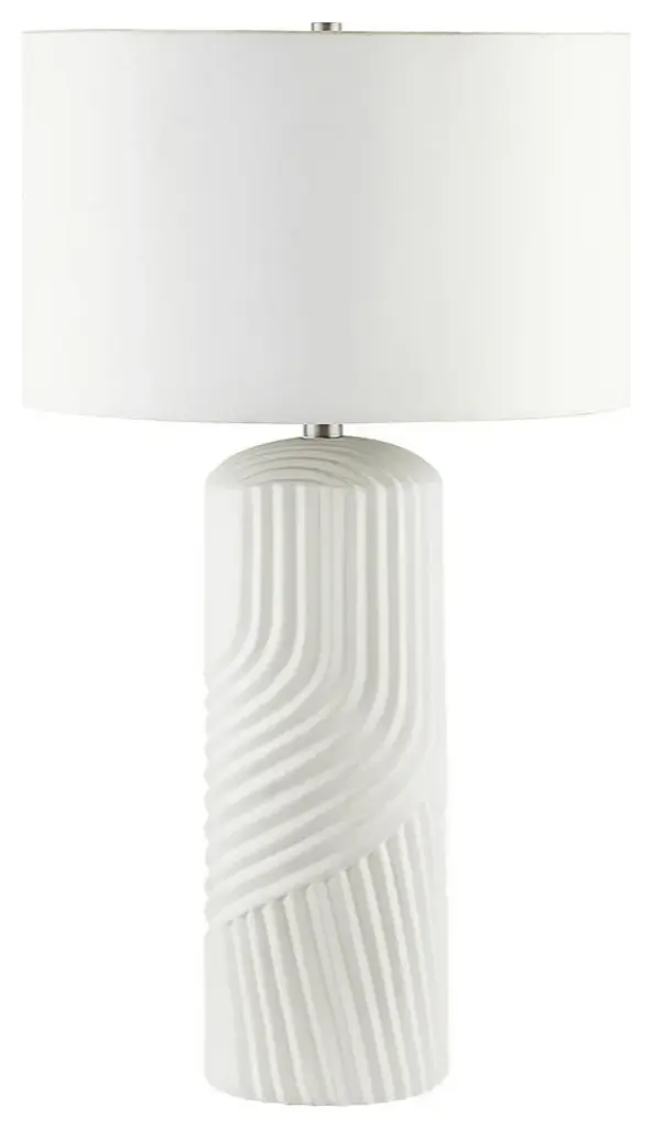 A textured ceramic structure lends complexity to the traditional table table lamp design in this piece. Subtle enough to blend into an interior yet unique enough to stand out, the choice is left to the homeowner for arrangement. All white in palette, with a touch of antique brushed brass, this table lamp brings a glowing quality to any room it''s set within.