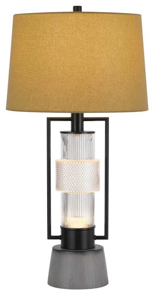 Style your home with this contemporary take on a classic lantern style lamp. It features a clear glass fluted font which has a functional led night light. This lamp is ships complete with a hardback fabric shade and matching finial.
