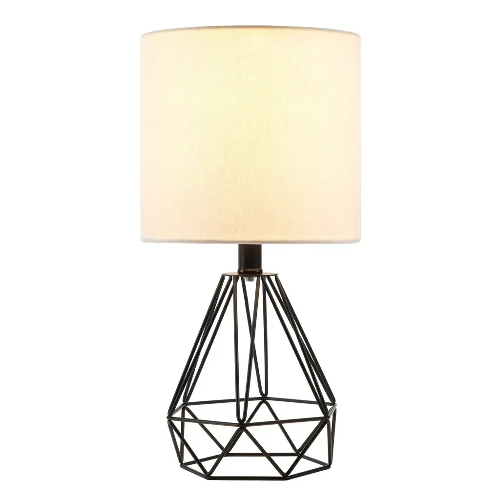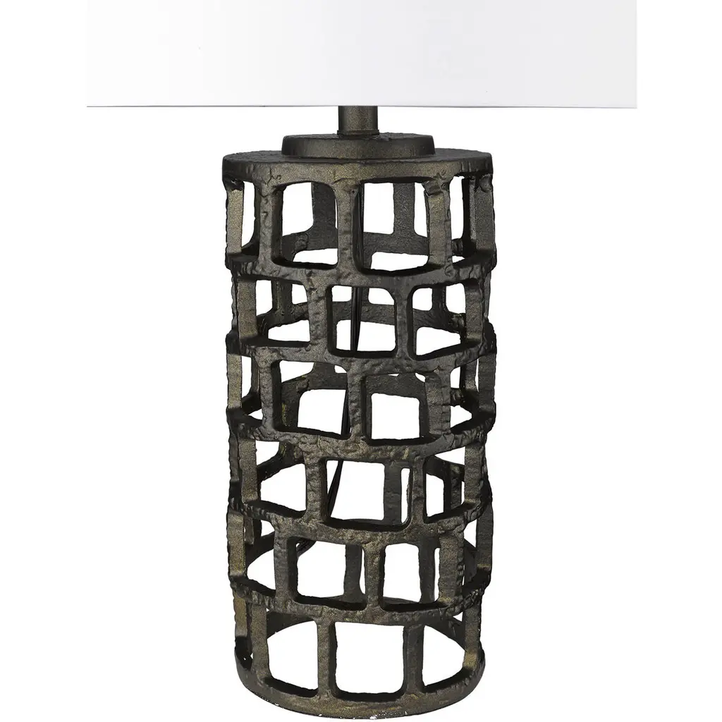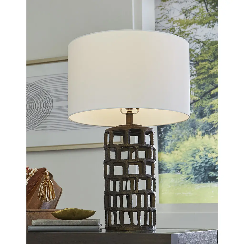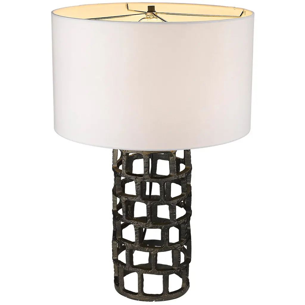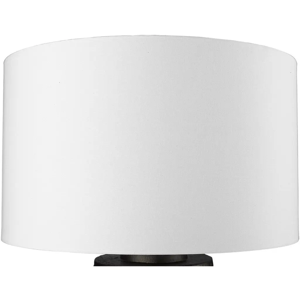 Update the look and feel of your space with Vallin. This lamp features a hand-forged iron body in a black gold finish and a white, fabric drum shade. Vallin is solidly beautiful.
