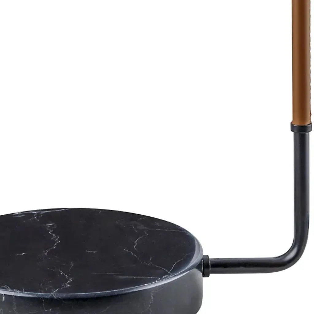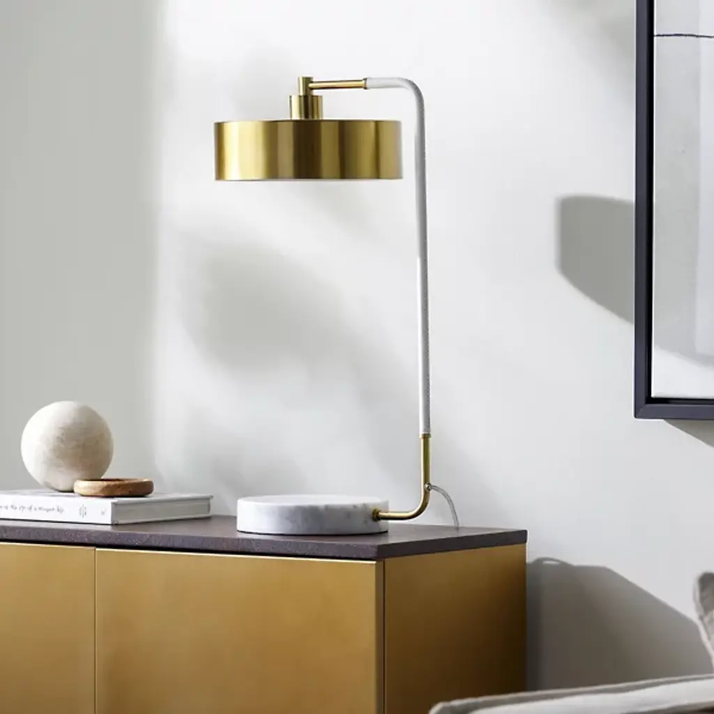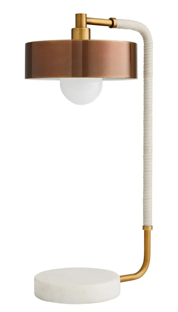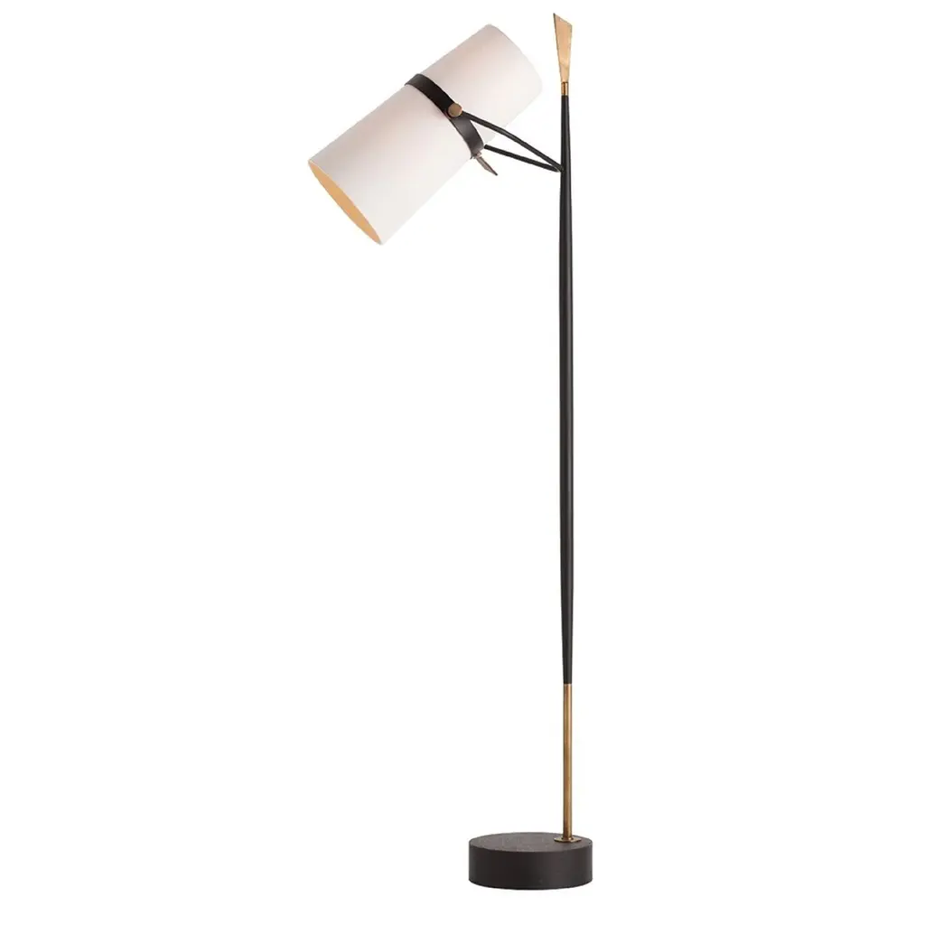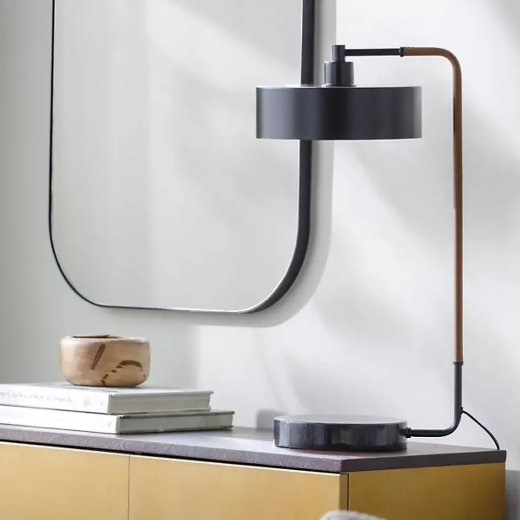 The Valo Table Lamp from Surya brings workshop-inspired character to everyday spaces. Its all-metal construction features raw, honest materials that tell an industrial story through texture and form. This lamp’s drum shade creates a focused pool of light beneath, while the contrasting leather-wrapped arm adds an unexpected organic touch. It works particularly well in spaces with other natural elements like wood and leather, creating a balanced dialogue between materials. The lamp’s convenient cord switch makes it easy to operate, while simple maintenance—just an occasional wipe with a dry cloth—keeps it looking its best.