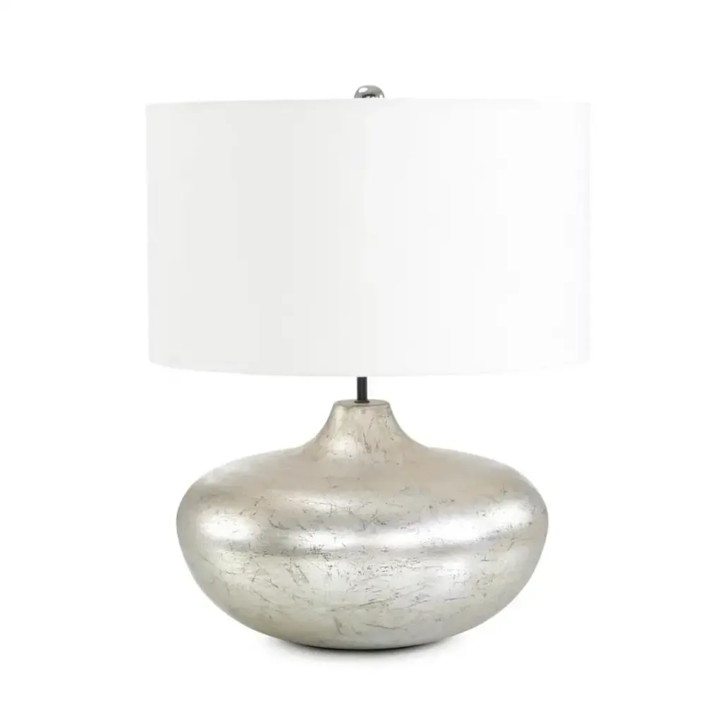 The curvaceous profile of the Vanisa Table Lamp is given a wealth of textural depth through its metallic silver hue with a textural distressed finish. The piece, crafted from mango wood throughout, features a slender black rod that extends upwards into a shiny finial in a polished nickel finish. The combination of distressed and polished looks of this turnkey lamp provide playful contrast and a wealth of depth to an interior space.