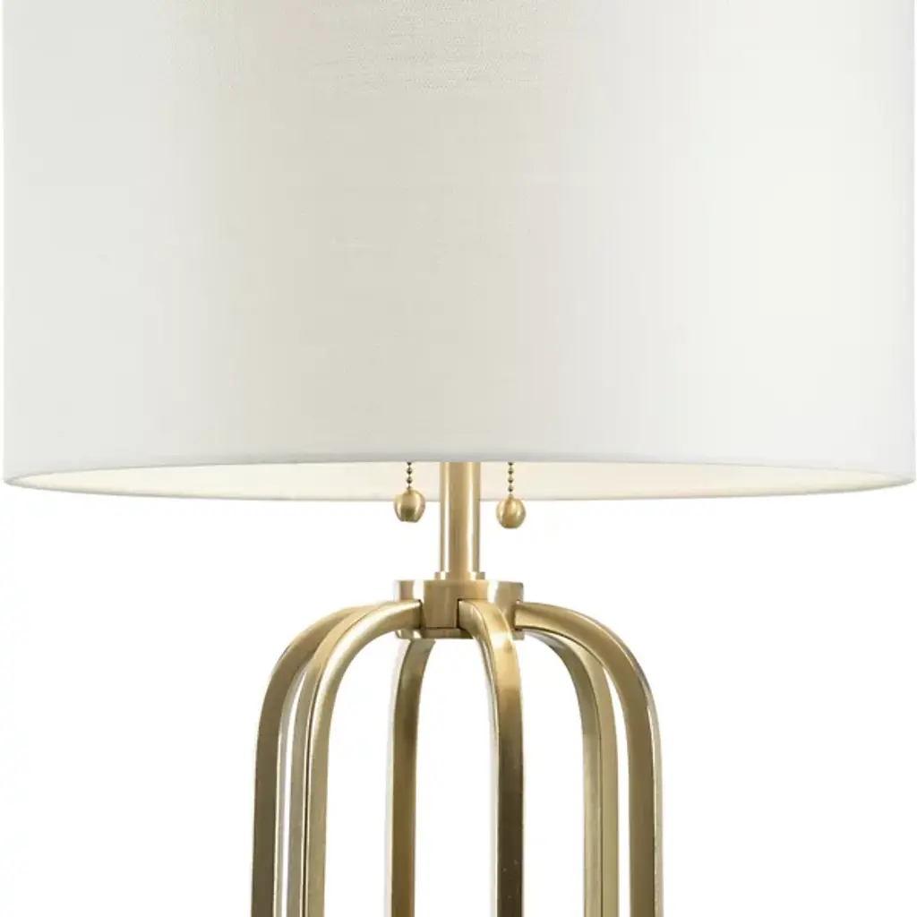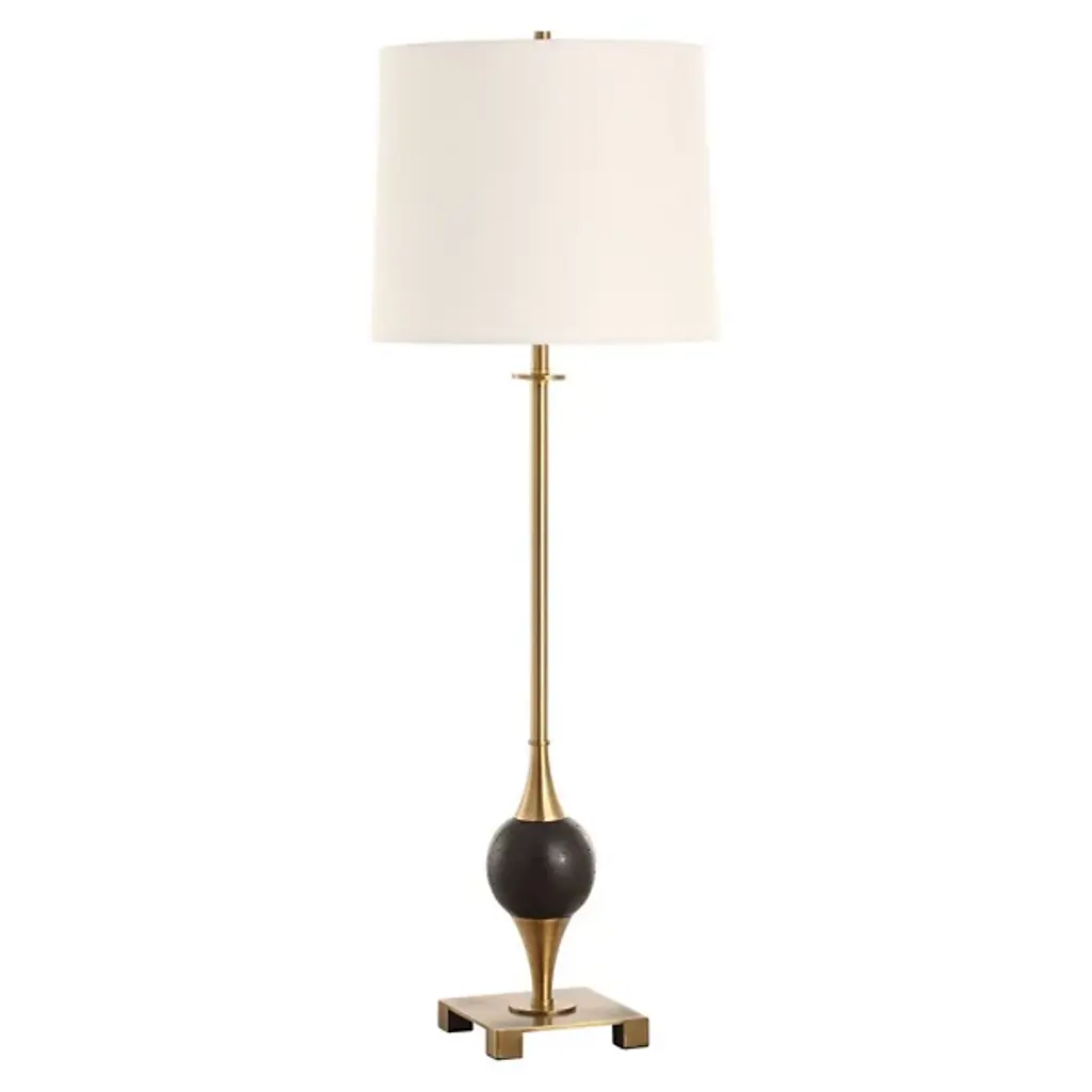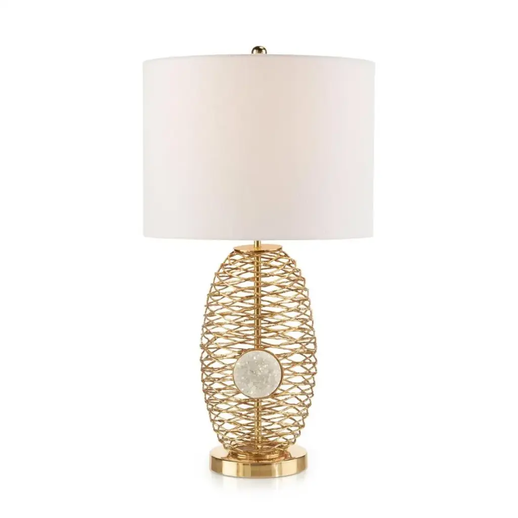 The Varese Table Lamp from Wildwood showcases natural calacatta gold marble within a distinctive metal framework. This design creates an intriguing interplay between solid stone and open structure. Its dual lights with convenient pull chains allow for adjustable brightness under a sleek white linen drum shade. This desk lamp’s versatile aesthetic suits various decor themes, seamlessly fitting into contemporary or country-inspired interiors. It works beautifully in home offices, living rooms, or as bedside lighting.