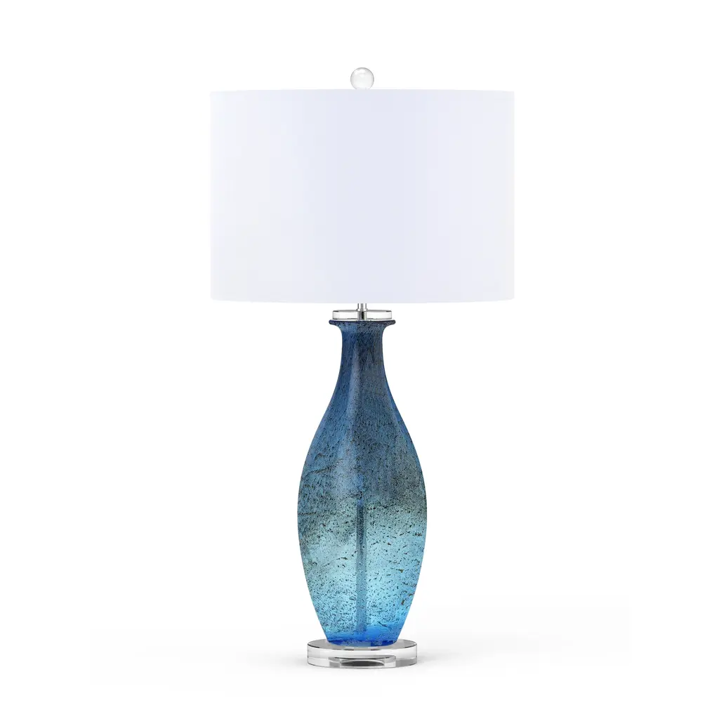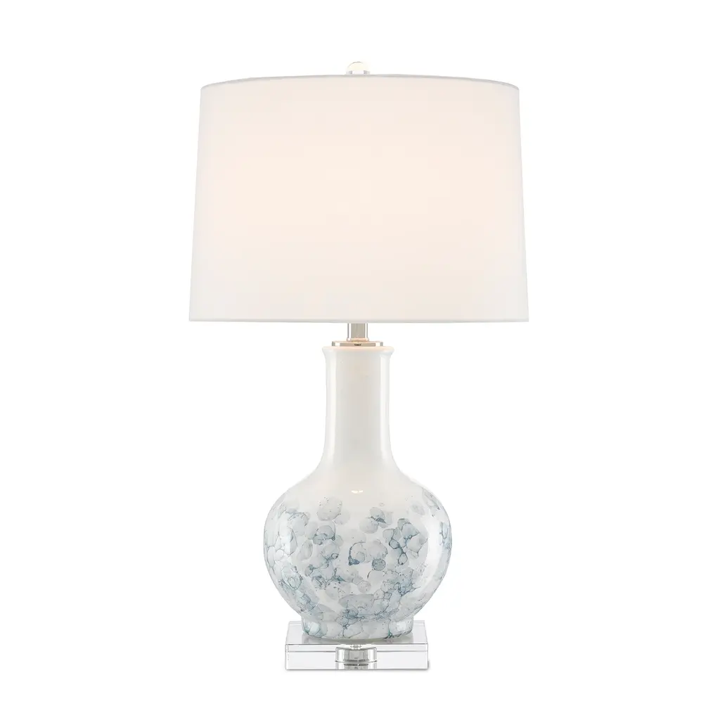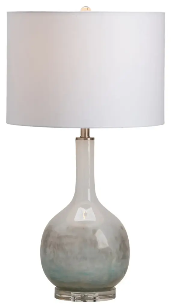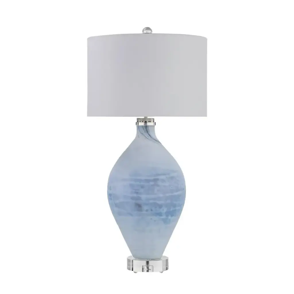 The Varuna Table Lamp gracefully infuses an interior space with tranquil themes of the coast. This art glass piece blends meandering blue and white tones to evoke the look of calm ocean waters. A round base of clear acrylic matches the ball finial, as well as the neck accent with aluminum trim in a Nickel finish. The look is completed by a white drum shade.