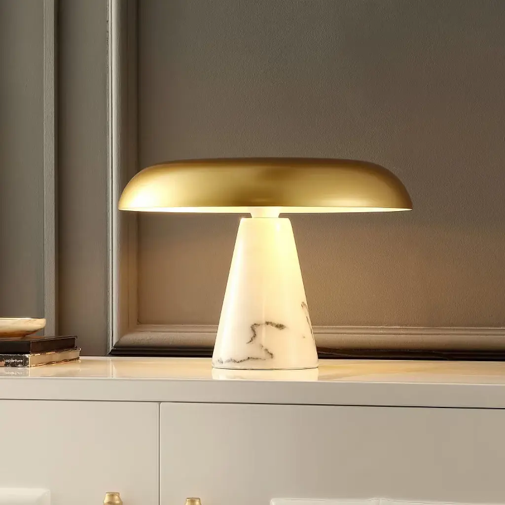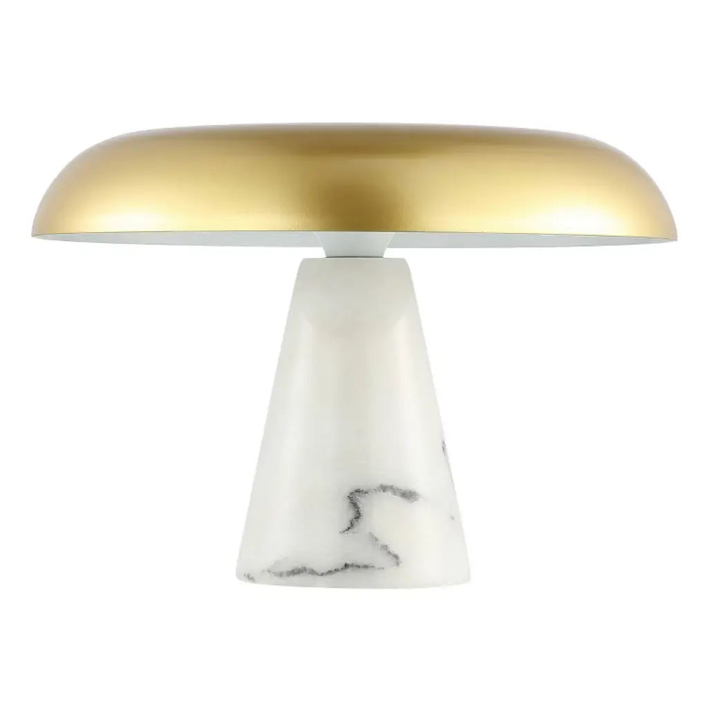 Enrich your space with the elevated drama and elegance of our Vaughan table lamp. With a striking geometry and a rich mix of materials, our table lamp brings impact and texture to any tabletop. It features a sleek and elongated dome shade for added drama and definition. The metallic brass shade is elevated upon a tapered, white marble base to add polish and grace to any corner. Offering focused illumination, our table lamp remains a stylish tone-setter for your bedroom, lounge, or home office. Care Instructions: Unplug lamps before using any cleaning solutions. Dust shades with a feather duster or with an appropriate vacuum-brush attachment. Wipe with a soft, dry cloth and clean lamp bases with the methods appropriate to the material. Avoid the use of chemicals and household cleaners as they may damage the finish.