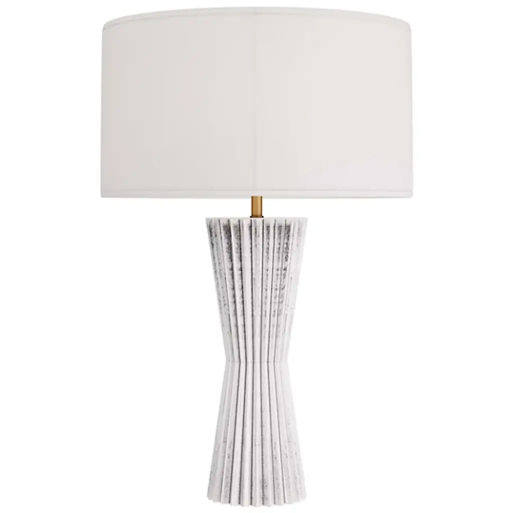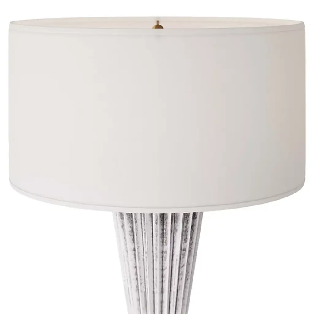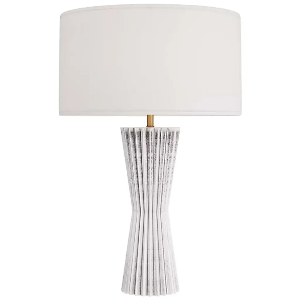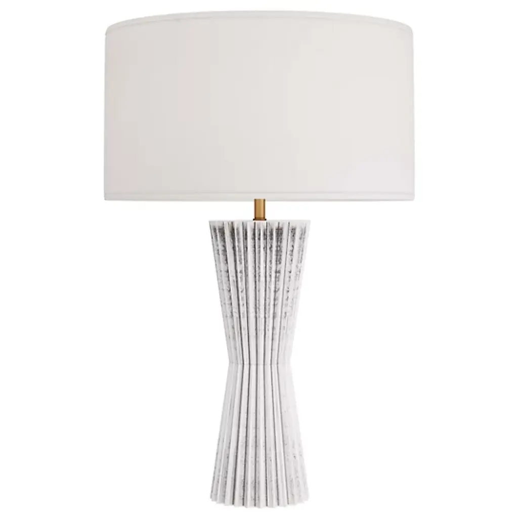 Presented by Arteriors, the Vayla Table Lamp showcases an elegant design in a lithe, hourglass silhouette with a cinched waist. It is crafted in ice-reactive ceramic, where the pigment settles into the lamp’s zig-zagging recesses to create dimension as light bounces off the lighter ridges. The piece is topped with a white linen drum shade, lined in white cotton.