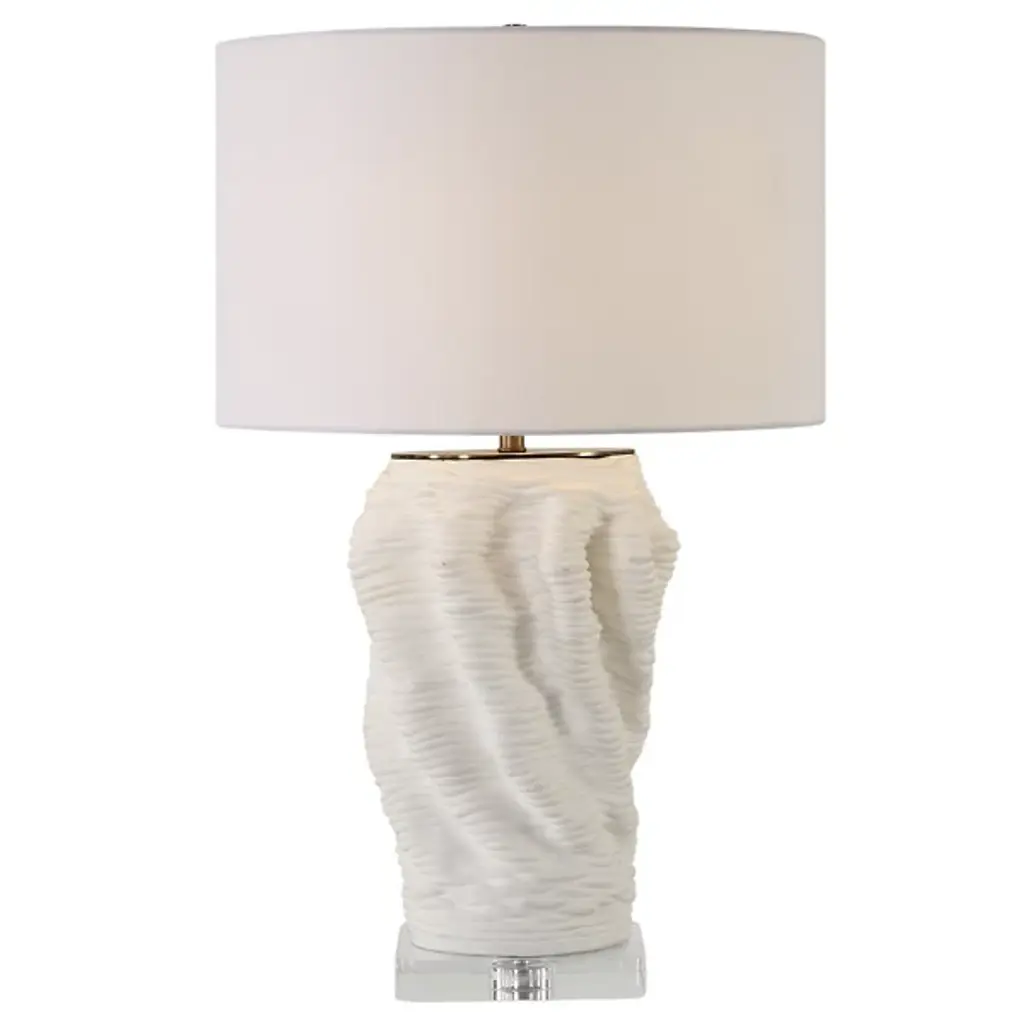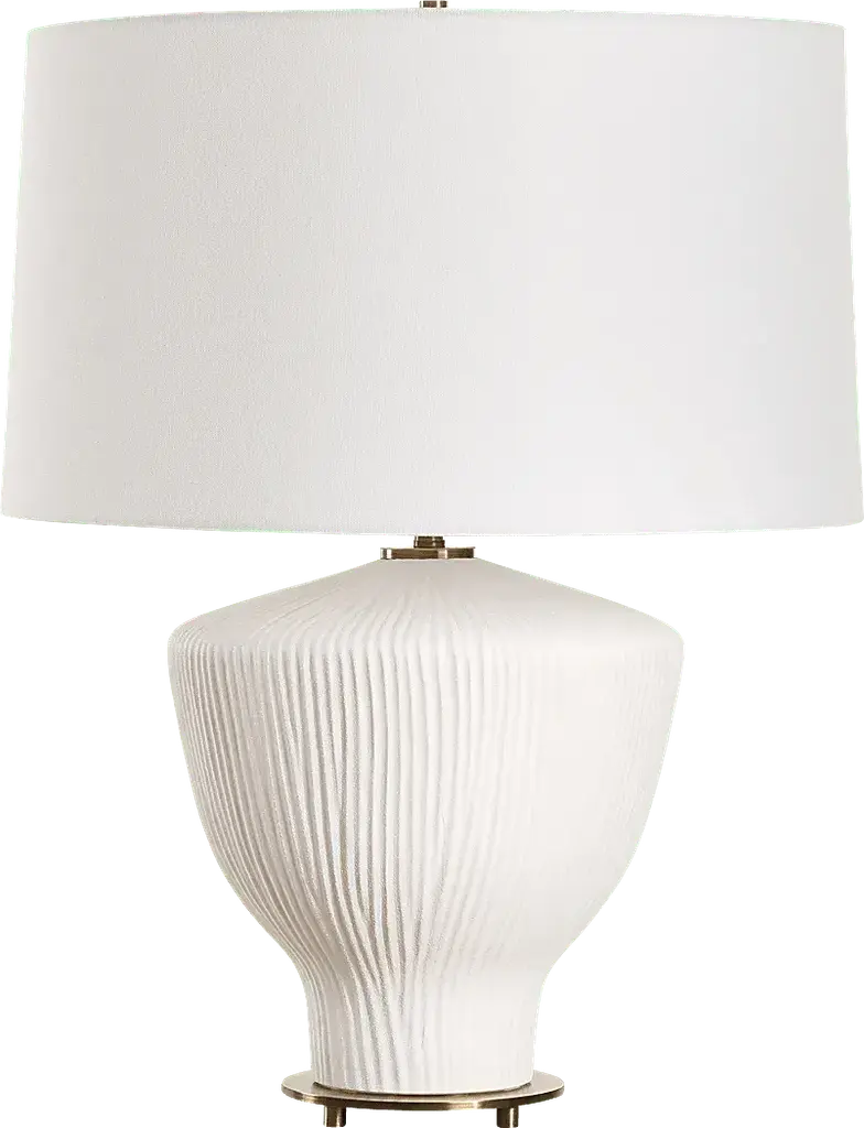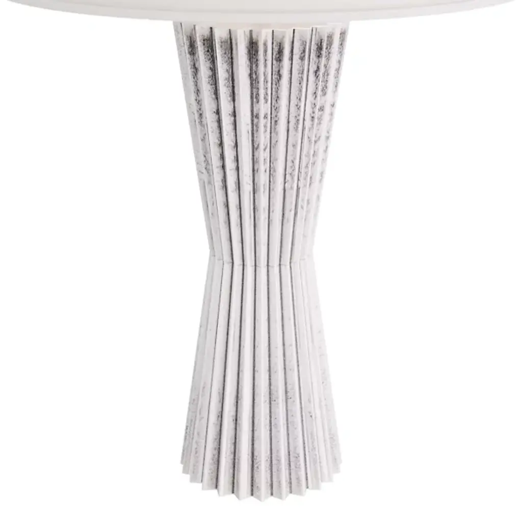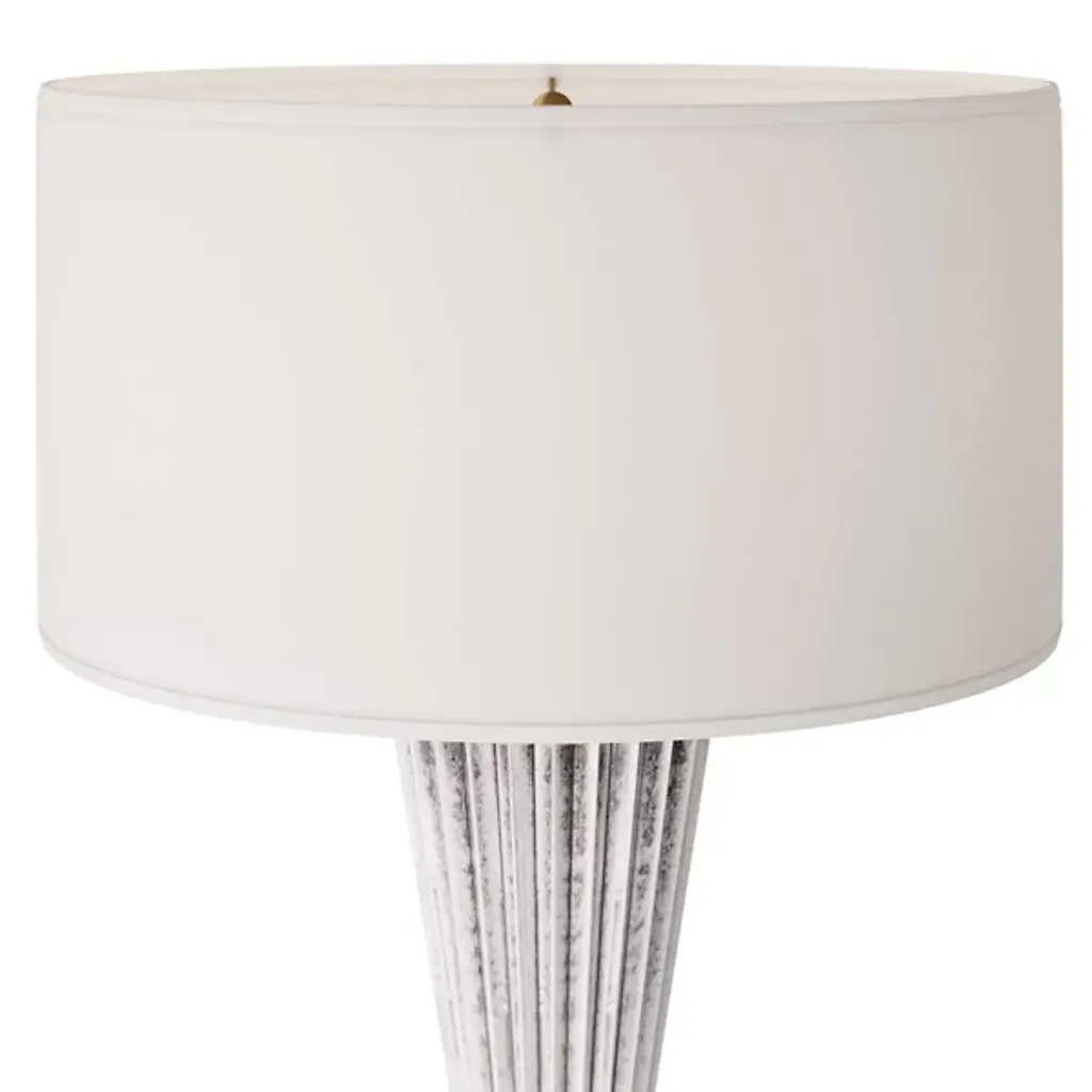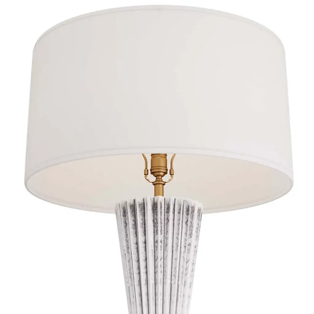 Presented by Arteriors, the Vayla Table Lamp showcases an elegant design in a lithe, hourglass silhouette with a cinched waist. It is crafted in ice-reactive ceramic, where the pigment settles into the lamp’s zig-zagging recesses to create dimension as light bounces off the lighter ridges. The piece is topped with a white linen drum shade, lined in white cotton.