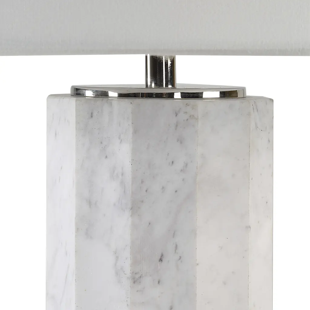 Known as the Carrara of Greece, Volakas marble was used in the design of this stunning table lamp for the modern aesthetic it provides. Its ivory shade not only complements this lamp perfectly, but also delivers diffused ambient light that sheds warmth and style throughout any contemporary space.