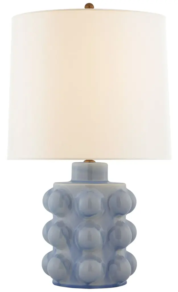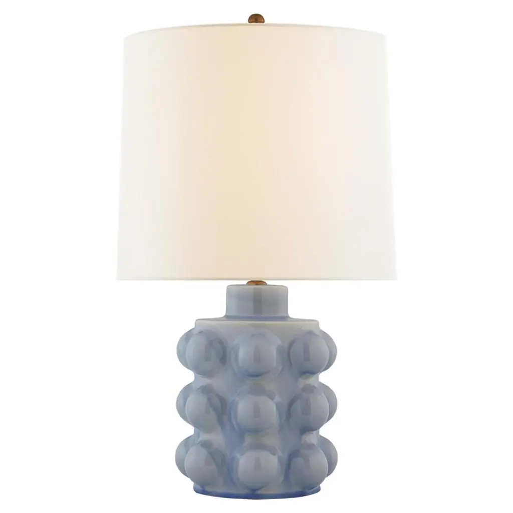 Beautifully and delicately crafted like an ancient piece of decoration. The Vedra Table Lamp from Visual Comfort Signature, formerly known as Visual Comfort, pulls one closer with an artisanal display of highlight-kissed patterns of bubble-like forms. The table lamp’s sculptural design informs the room’s aesthetic even while being off. Sitting secure on the table, the base’s ceramic construction gives it an alluring earthy surface. This surface produces soft shifts in tone and texture. These shifting notes please as they lay across a pattern of partial globes on the base. The piece honors tradition with a clean drum shade. A warm ambient aura surrounds the design and touches up the globe accents with rich highlights.
