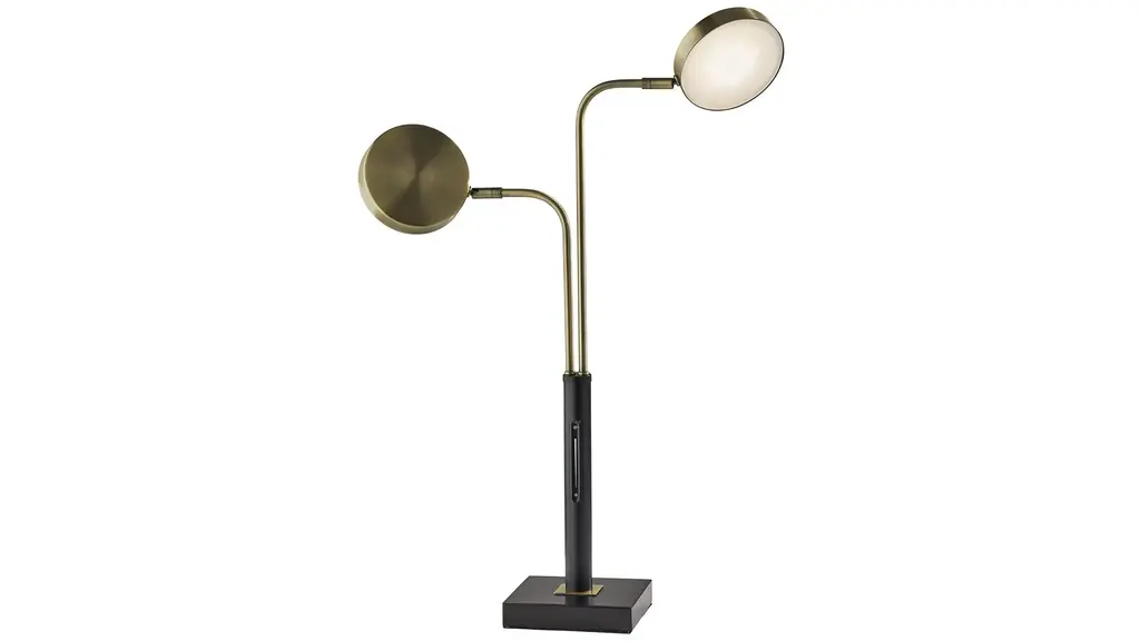 A design with an indisputable geometric inspiration, this table lamp is offered in a refined chromatic palette of matte black and gold, finishes accenting the cylindrical brass structure and the metal shades and base, respectively. Fitted to a base with rounded sides, the stem branches out into two arms, each sustaining an ensemble of three piled cones that create an intriguing shading unit for the LED light housed within (2x4W; included).