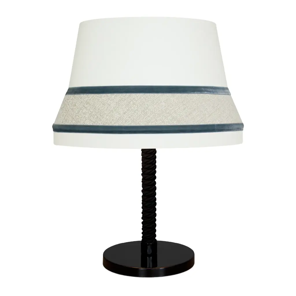 Introducing the Velvet Trimmed Table Lamp | Contardi Audrey, inspired by the iconic hat of Audrey Hepburn. Its elegant and exclusive design makes it perfect for sophisticated settings, from lobbies and boutiques to classy homes. Its shades feature a mix of cotton, boucle fabric, and velvet trimmings, available in various colors. The stem is beautifully covered in a braided silk cord. A true style statement.