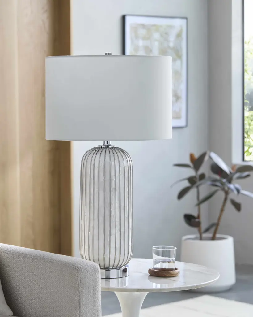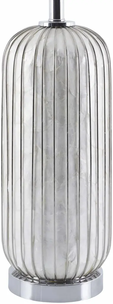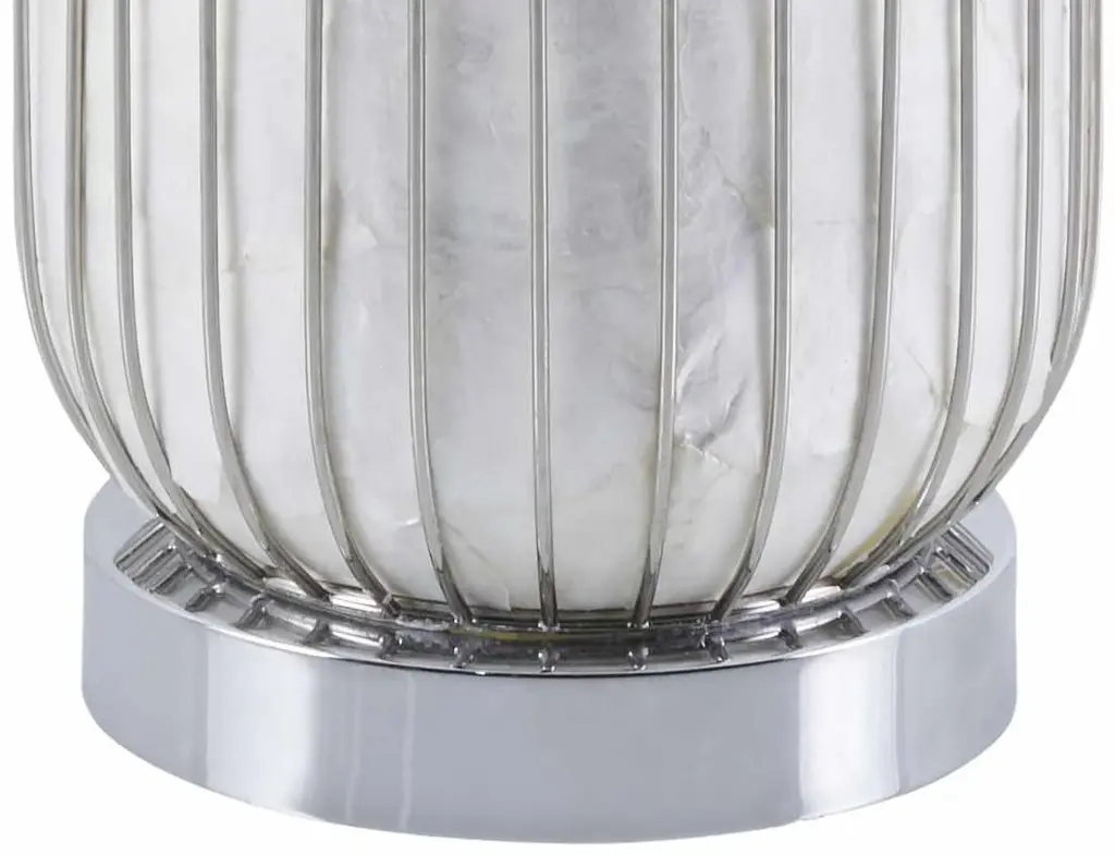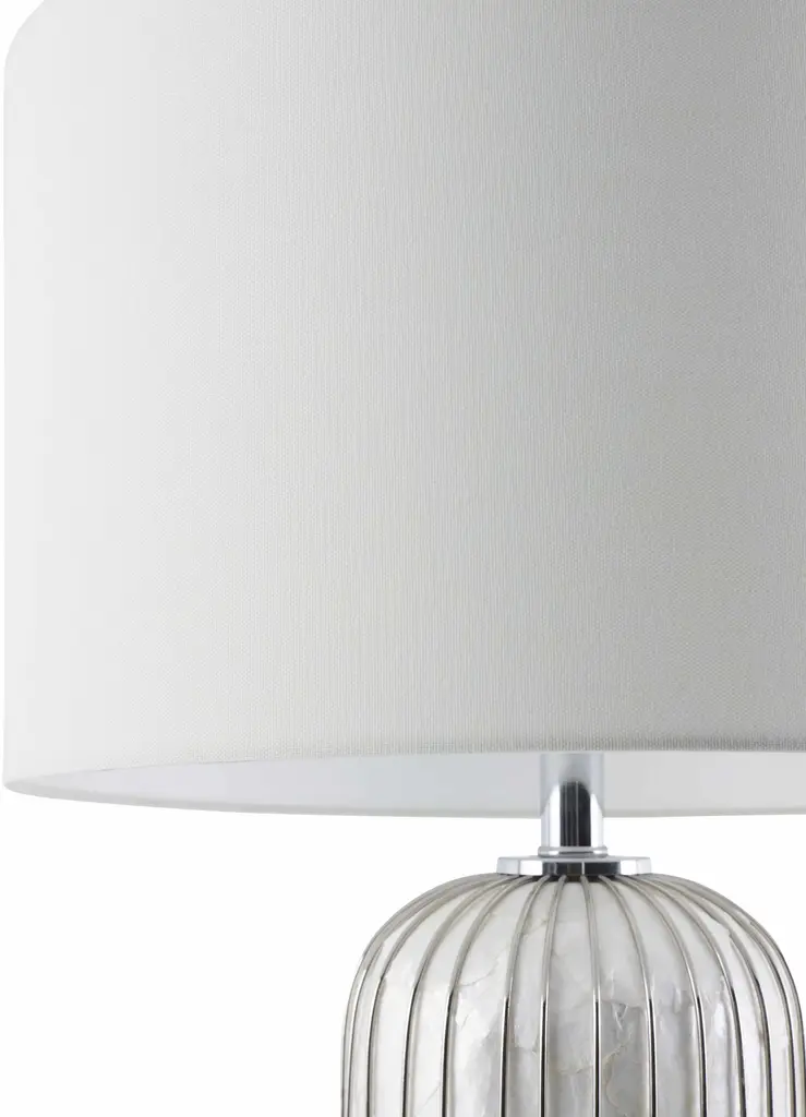 Collection: Vendeville Colors: White, Silver Gray, Metallic - Nickel, Translucent Material: Body: Shell / Base: Iron / Shade (Outside): Linen / Shade (Inside): Polyester / Finial: Iron Made In: China Lighting Type: Accent Table Lighting Base: Iron Base Color: Metallic - Silver Shade Material: Linen, Polyester Shade Color: White, White Cord Length: 6' Switch Type: Rotary Number of Bulbs: 1 Socket Type: E-26 Bulb Wattage: 100W