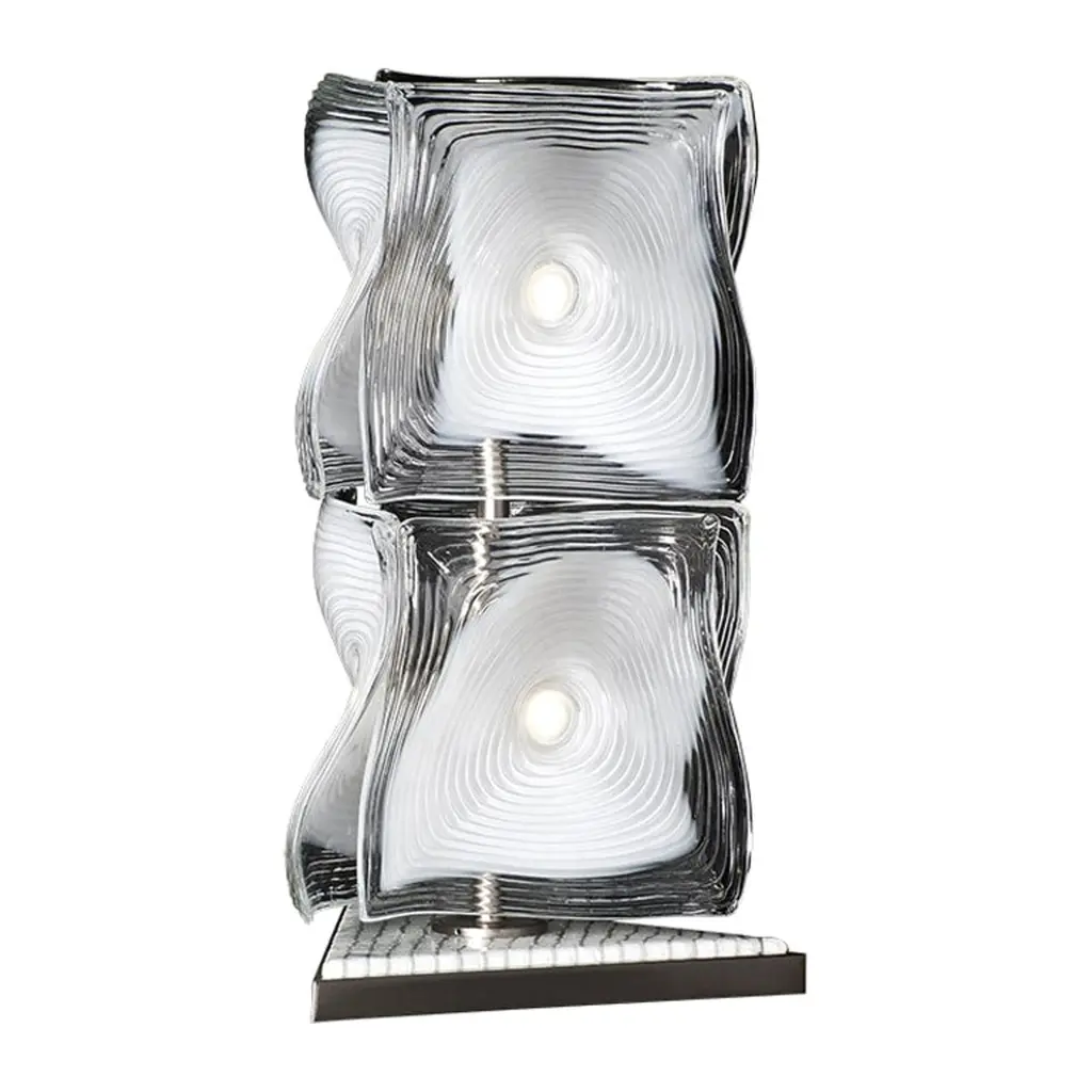 Veliero Tavolo Table lamp, designed by Tadao Ando and manufactured by Venini, is available in 2 different versions. "The strictly ruled geometry becomes a Wave with soul that gains complexity in response to light", says the designer. Limited edition of 29 + 5 art pieces. Indoor use only.Dimensions: W 30 cm x D 30 cm x H 78 cm.