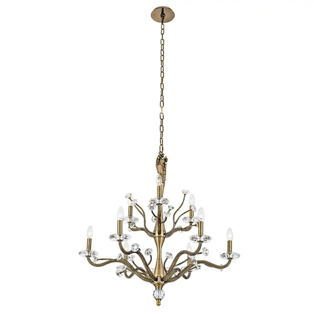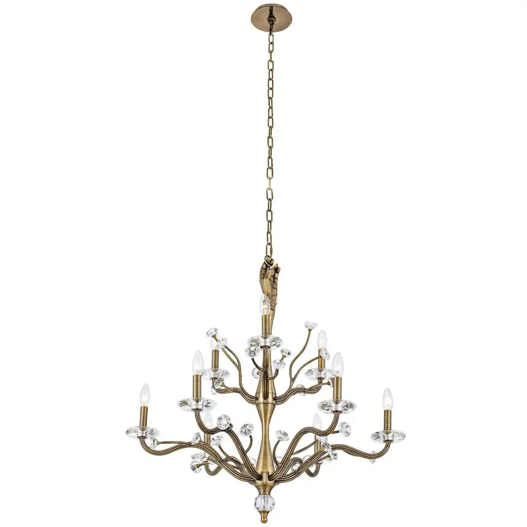 Add a stylish and effervescent appeal to inside spaces with the outflung elegance of the Venus Chandelier from Kalco Lighting. Starting conventionally with a single strand of chain descending from a circular canopy, it uses a hand-shaped finial to support a chandelier structure of curving cast brass below. Arcing arms sweep out and up to open candelabra lamps spaced evenly around its central hub, escorted by bobeches and small floral-styled accents, both fashioned from faceted Firenze crystal that glitters with reflected radiance.