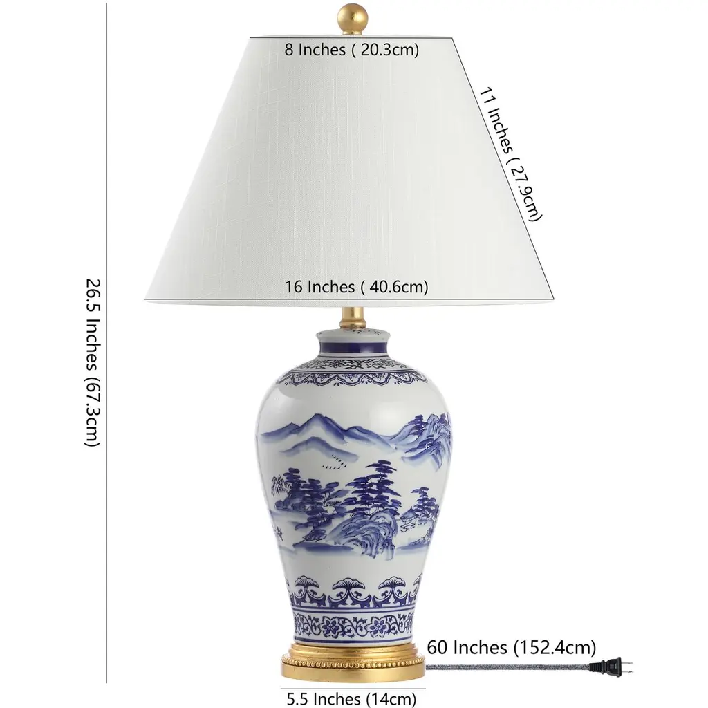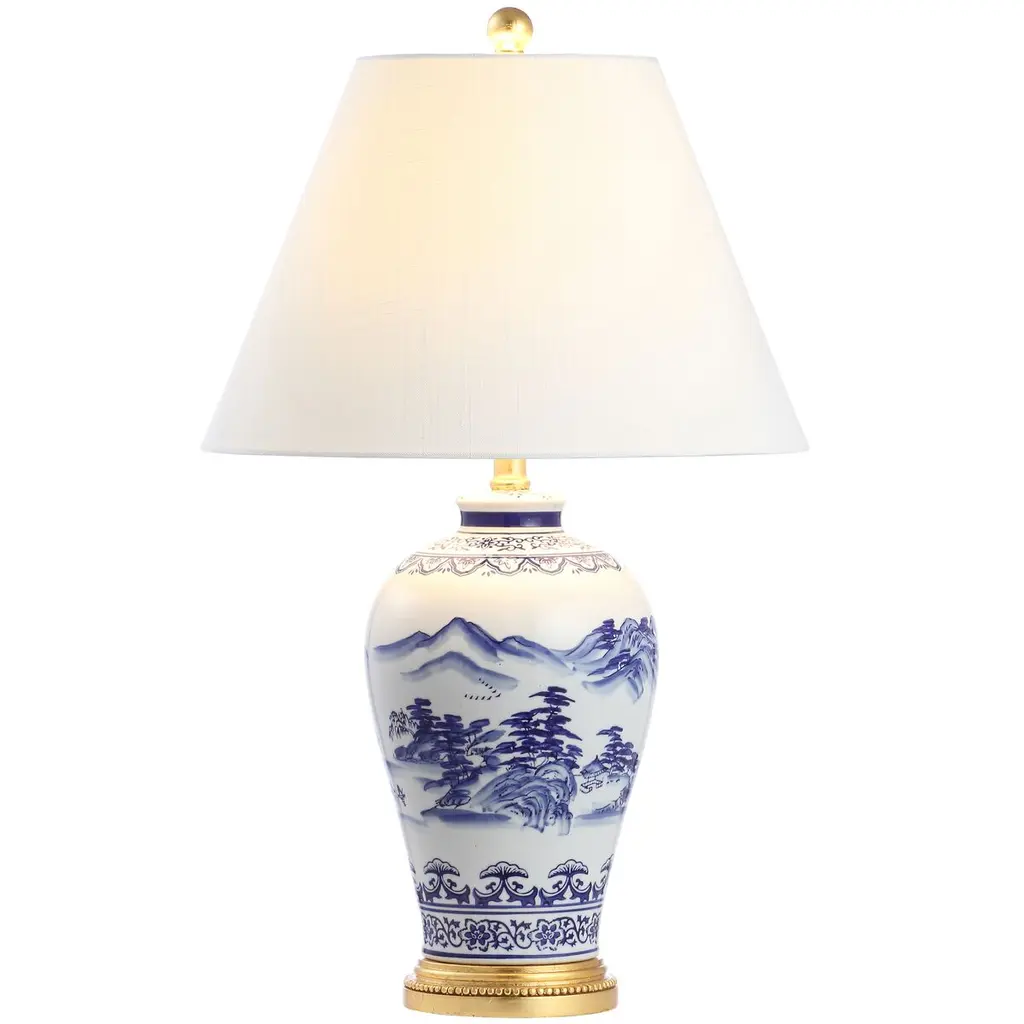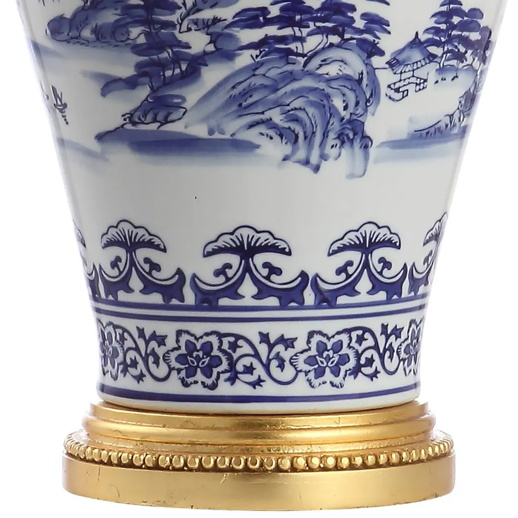 In elegant chinoiserie tradition, a blue-and-white landscape graces this table lamp's shapely ceramic body. Beading on the gleaming brass base heightens the elegance, as do the white linen shade and the silk-wrapped cord.