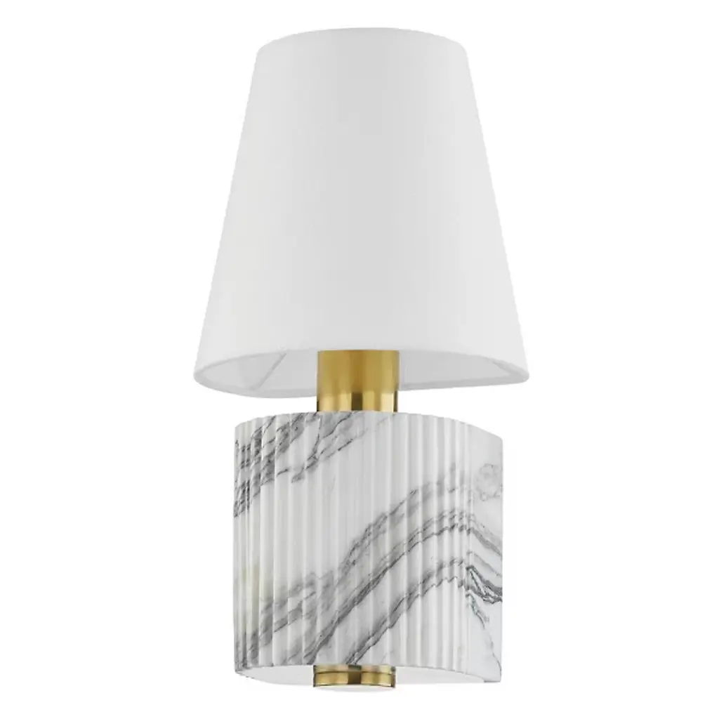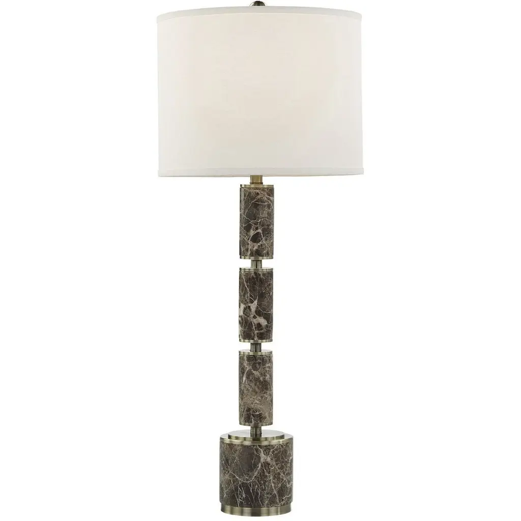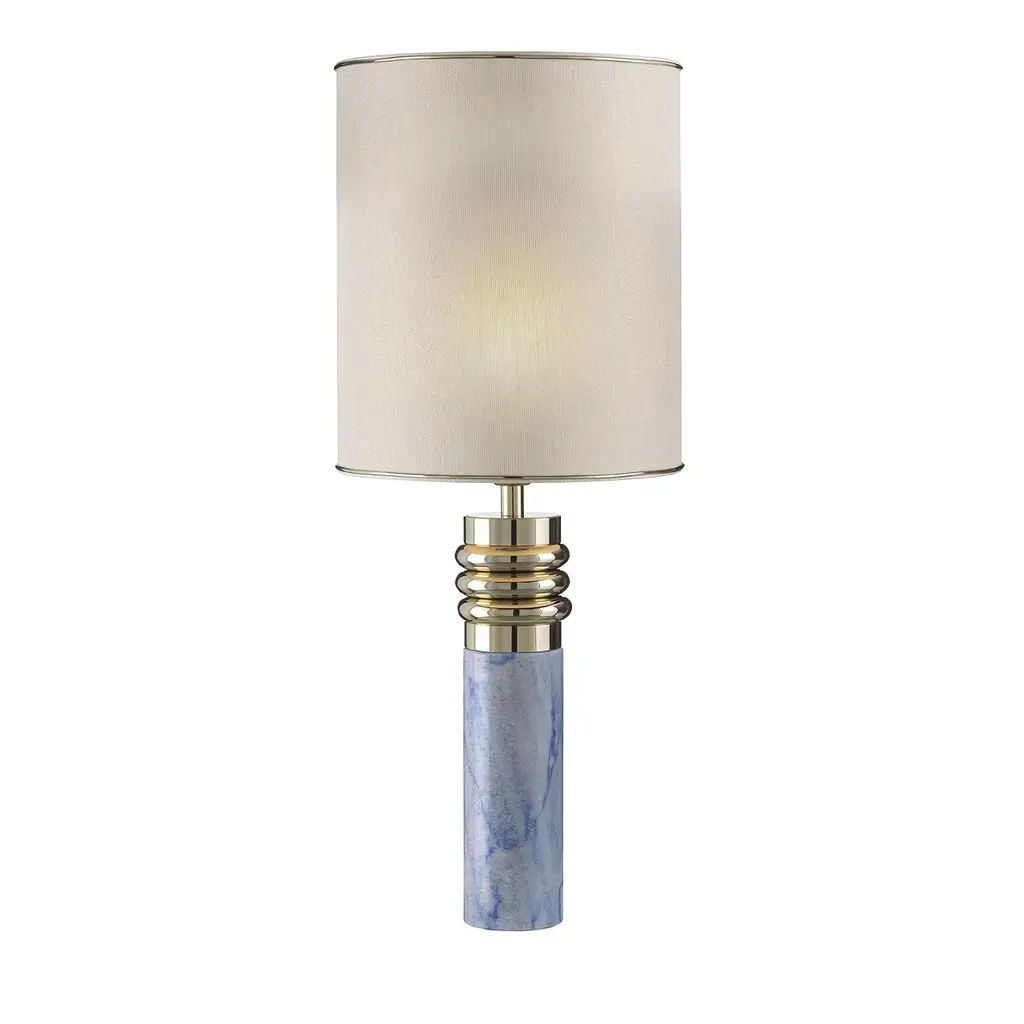 Classic modern lines ennobled by glowing brass details lend this table lamp indisputable elegance, made timeless by the inclusion of a cylindrical base in Verde Alpi marble. Alluring in its peculiar, intricate light tracery set against a green backdrop, its shades recalling rangeland from Italy's Val D'Aosta region, from whose mountains this fine marble is quarried. A beige fabric lampshade shades the light produced by the single E27 bulb.