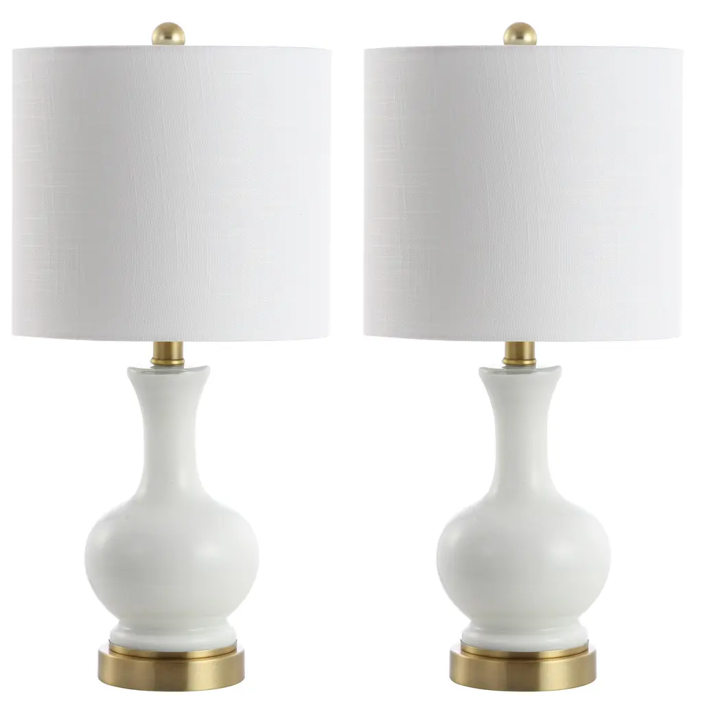 Elegantly simple and shaped like a Grecian vase, the Vermont 22" Glass/Metal LED Table Lamp Set by JONATHAN Y comes in a glossy white finish with brass fittings, a linen lampshade, and silk-wrapped cord. This lamp is carefully designed with components that enhance its overall appeal, making it a must-have for any modern home.Features:Dimensions:About us:
