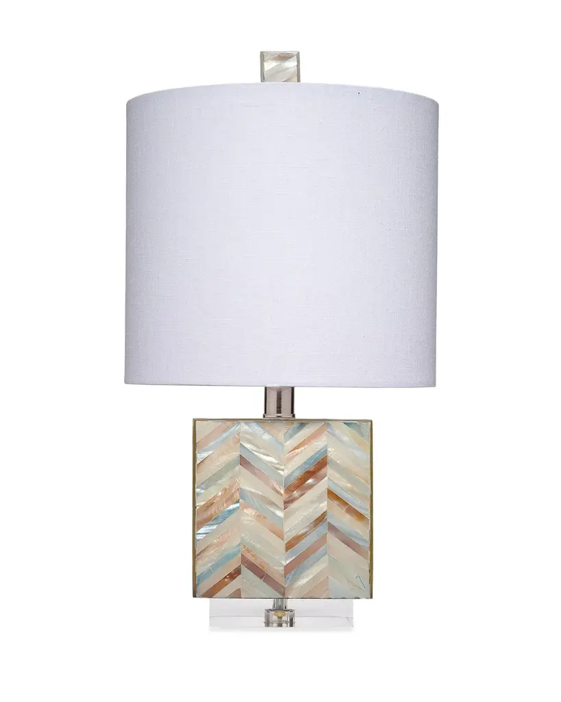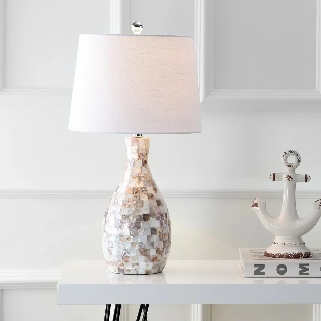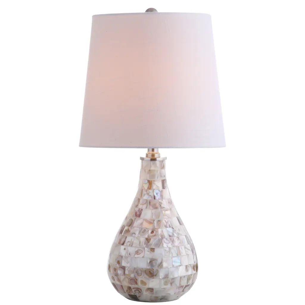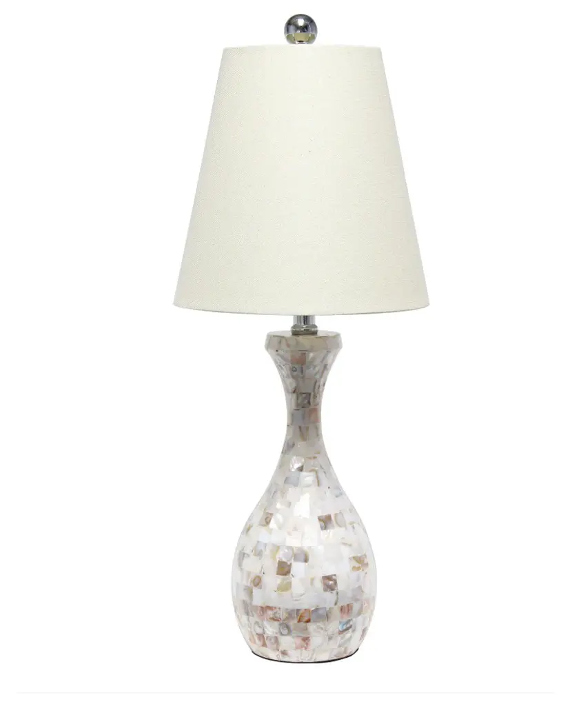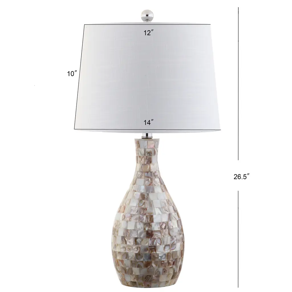 The elegantly curved base of this nearly 27" table lamp is carefully adorned with a mosaic of square capiz shell tiles and chromed accents. A white linen shade balances the look while a silk-wrapped cord provides style all the way to the plug. You'll love how the shells reflect the warm glow of the bulb when illuminated and their many shades of natural beauty from ivory to bronze.