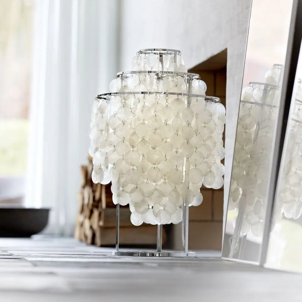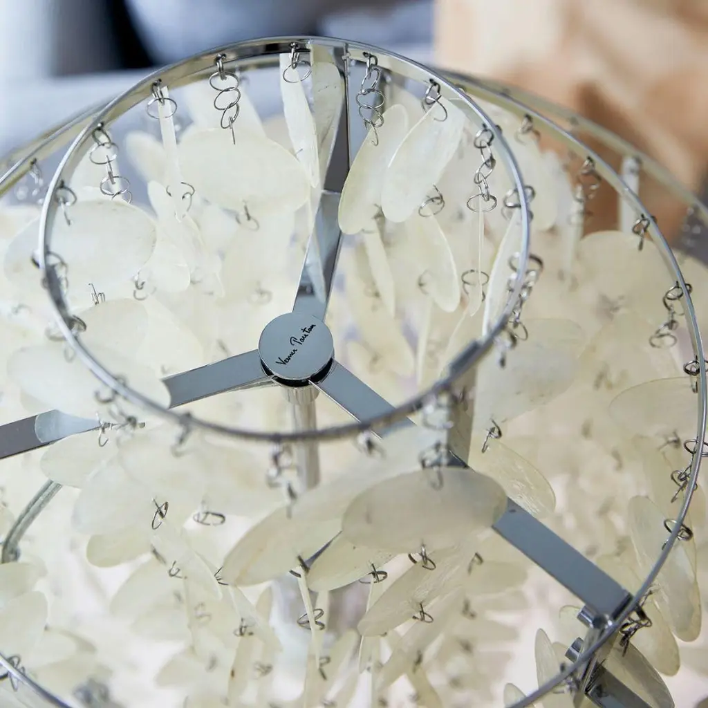 Verner Panton 'Fun 1TM' table lamp in sea shells and chrome for VerpanVerner Panton was one of Denmark's most legendary modern furniture and interior designers. His innovative experimentation with new materials, bold shapes and vibrant colors shines through in his most iconic pieces, faithfully and sustainably re-editioned by Verpan since 2003. First designed in 1964, the 'Fun 1TM' has long been considered Panton's greatest masterpiece in lighting design. Featuring 3 chrome rings from which an array of circular sea shells are artfully suspended from, the 'Fun 1TM' highlights the unmistakable brilliance of Panton. Created to be equally appealing whether illuminated or not, the 'Fun 1TM' is executed in a chrome plated structure, sea shells and stainless steel rings to the exacting standards of Verpan using the finest materials available.Price per item. Available in unlimited quantities in 2 sizes, brass or chrome, as well as in table, sconce, floor and chandelier variations - please see our separate listings. This listing is for the 'Fun 1TM' table lamp in chrome, sea shells and stainless steel.In stock lead time 2-4 weeks. Out of stock can add an additional 8 weeks or more. Please note that lead times, cost and inventory availability are subject to change without notice. Please contact us for current lead times prior to placing time-sensitive orders.Accommodates single standard medium base E26 bulb (bulb not included). Max 60 watt, lower with incandescent. Powered by 7.1' cord with integrated on/off switch. This lamp is UL listed.Made to order. All sales are final.