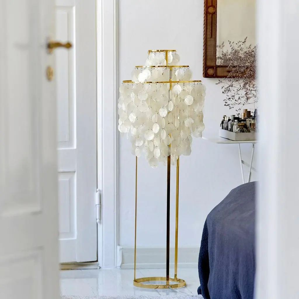 Verner Panton 'Fun 2TM' table lamp in sea shells and brass for VerpanVerner Panton was one of Denmark's most legendary modern furniture and interior designers. His innovative experimentation with new materials, bold shapes and vibrant colors shines through in his most iconic pieces, faithfully and sustainably re-editioned by Verpan since 2003. First designed in 1964, the 'Fun 2TM' has long been considered Panton's greatest masterpiece in lighting design. Featuring 2 chrome rings from which an array of circular sea shells are artfully suspended from, the 'Fun 2TM' highlights the unmistakable brilliance of Panton. Created to be equally appealing whether illuminated or not, the 'Fun 2TM' is executed in a chrome plated structure, sea shells and stainless steel rings to the exacting standards of Verpan using the finest materials available.Price per item. Available in unlimited quantities in 2 sizes, brass or chrome, as well as in table, sconce, floor and chandelier variations - please see our separate listings. This listing is for the 'Fun 2TM' table lamp in brass, sea shells and stainless steel.In stock lead time 2-4 weeks. Out of stock can add an additional 8 weeks or more. Please note that lead times, cost and inventory availability are subject to change without notice. Please contact us for current lead times prior to placing time-sensitive orders.Accommodates single standard medium base E26 bulb (bulb not included). Max 60 watt, lower with incandescent. Powered by 7.1' cord with integrated on/off switch. This lamp is UL listed.Made to order. All sales are final.
