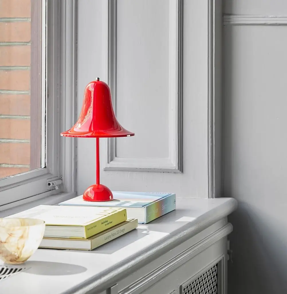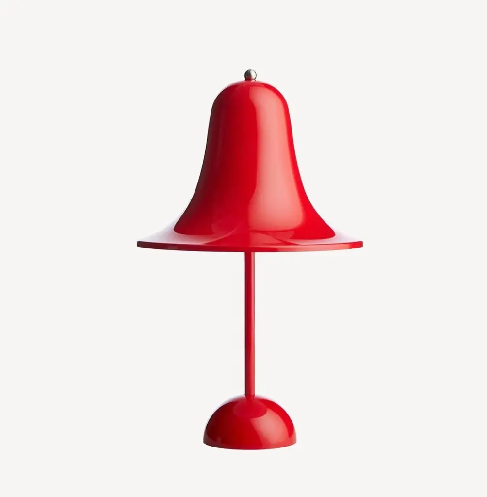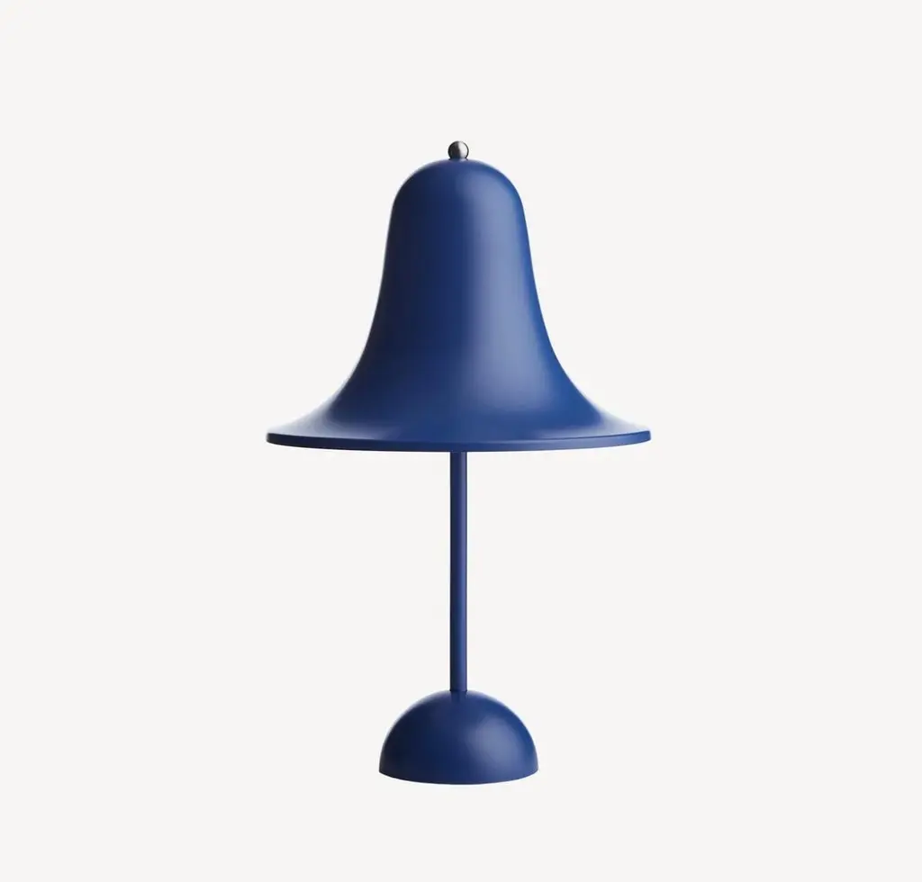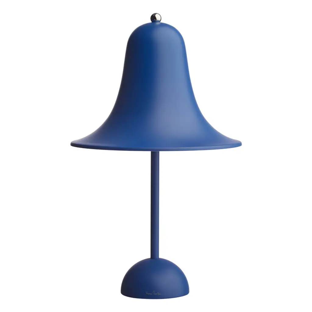 Verner Panton 'Pantop Portable' table lamp in 'Matt Classic Blue' for Verpan. Designed in 1980. New, current production.This is a versatile smaller and wireless version of the 'Pantop' table lamp, usb-chargeable. The elegant Pantop line was designed by Verner Panton in 1980, and has for a long time been a staple of the Verpan collection. Pantop is characterized by a bell-like, widely flaring shade which is mounted with the aperture facing down. The new Pantop Portable is a modern version of the Pantop design that uses modern materials and technologies. Something that Panton himself always sought.Pantop Portable adds a level of ease of use and flexibility that allows you to take the light with you - from room to room, and create the desired atmosphere wherever you are. With seven hours of operating time, Pantop Portable allows you to enjoy the flexibility of light for an entire evening where there is no access to power. The three-stage dimmer allows you to adjust the light level to the desired atmosphere and setting.Verner Panton (1926-1998) was an inspirational and colourful personality. A unique person with a special sense of colours, shapes, light function and room. Over the course of his career, Verner Panton (1926-1998) introduced a series of modern lamps with personalities unlike any of his Scandinavian contemporaries. With a remarkable faith in the unlimited possibilities of the form, he worked successfully to create a new set of theories about how lighting should work and how it should influence its surrounding.
