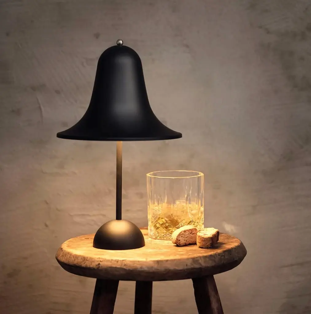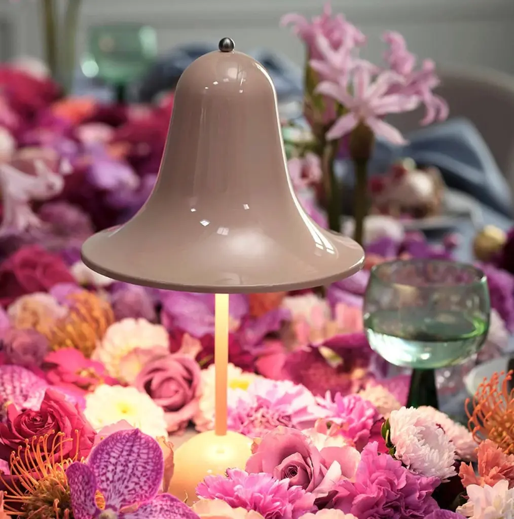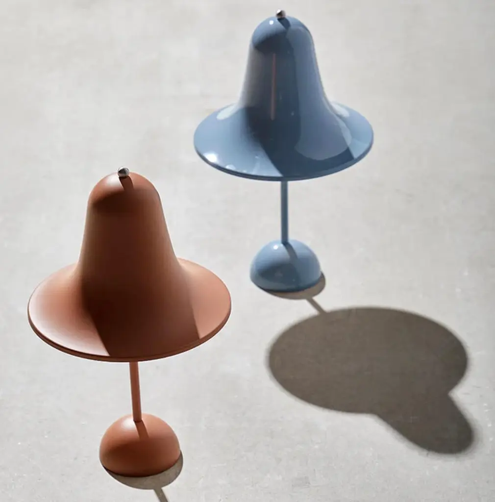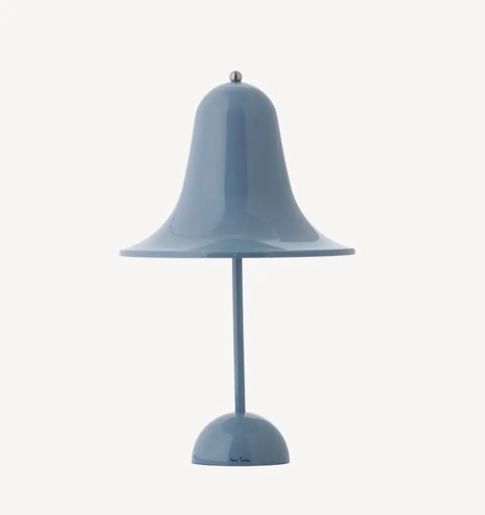 Verner Panton 'Pantop Portable' table lamp in 'Dusty Blue' for Verpan. Designed in 1980. New, current production.This is a versatile smaller and wireless version of the 'Pantop' table lamp, usb-chargeable. The elegant Pantop line was designed by Verner Panton in 1980, and has for a long time been a staple of the Verpan collection. Pantop is characterized by a bell-like, widely flaring shade which is mounted with the aperture facing down. The new Pantop Portable is a modern version of the Pantop design that uses modern materials and technologies. Something that Panton himself always sought.Pantop Portable adds a level of ease of use and flexibility that allows you to take the light with you - from room to room, and create the desired atmosphere wherever you are. With seven hours of operating time, Pantop Portable allows you to enjoy the flexibility of light for an entire evening where there is no access to power. The three-stage dimmer allows you to adjust the light level to the desired atmosphere and setting.Verner Panton (1926-1998) was an inspirational and colourful personality. A unique person with a special sense of colours, shapes, light function and room. Over the course of his career, Verner Panton (1926-1998) introduced a series of modern lamps with personalities unlike any of his Scandinavian contemporaries. With a remarkable faith in the unlimited possibilities of the form, he worked successfully to create a new set of theories about how lighting should work and how it should influence its surrounding.