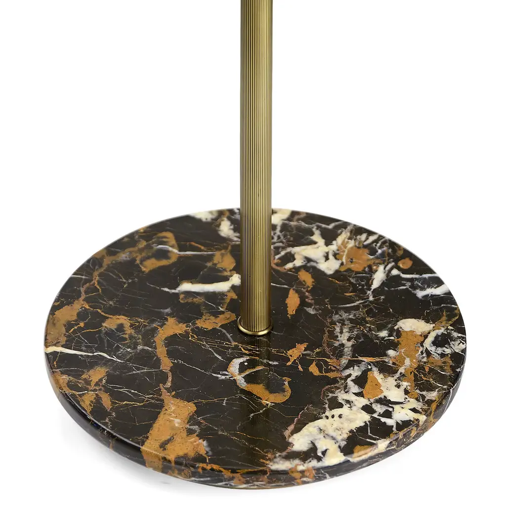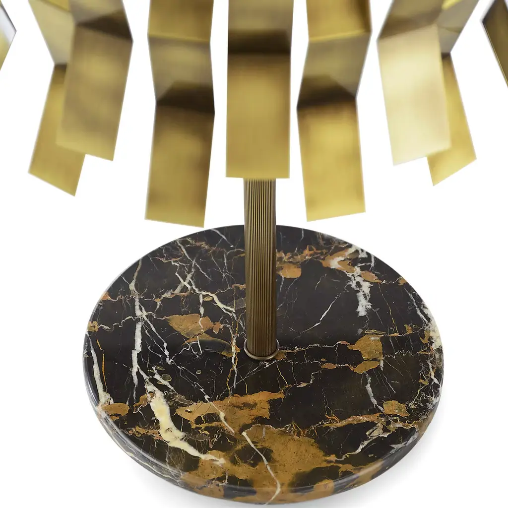 This striking brass sconce, designed by Studio 63 for Marioni, is decorated with geometrical metal accents that run all around its round perimeter and LED strip lighting. The base is an exquisite Saint Laurent marble ring.