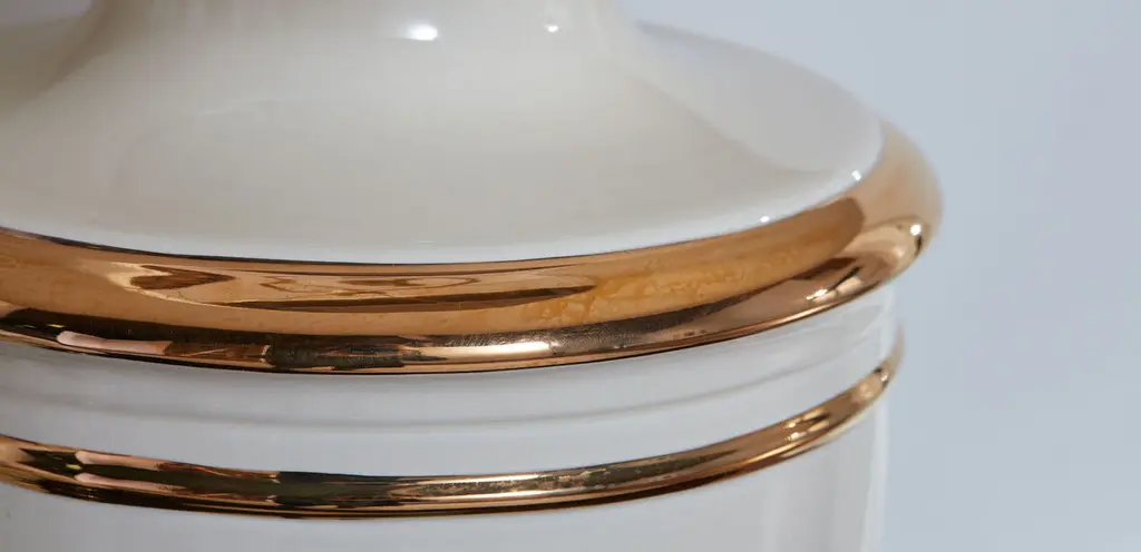 This elegant, urn-style lamp features a high-gloss ceramic base with golden trim and a traditional, shallow drum-style shade. It’s the perfect accent for a night table, end table, or desk.