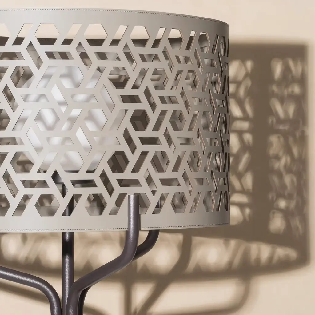 This stylish and functional lamp features a metal structure that supports the dynamic perforated Technoleather lampshade. The led light source grants high performance while also offering low power consumption. Crafted from the finest high quality regenerated leather, the lamp is available in the Venezia or Vienna patterns and comes in tones of soft and neutral gray.