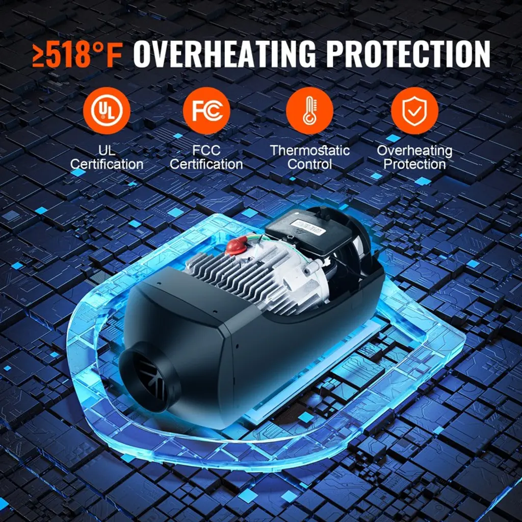 Feature: Efficient Heating: Heater Power: 5 KW; Rated Voltage: 12V & 24V. Applicable Range: 161-215ft²/15-20 m². VEVOR diesel air heater adopts a sandblasting aluminum heat exchanger for rapid heat production and transfer, ensuring a comfortable temperature inside your vehicle or boat within 10 minutes. Low Energy Consumption & High Output: Save on fuel costs with our diesel air heater's precision low-noise fuel pump, consuming only 1 gallon per night and reducing fuel consumption to a range of 0.16-0.52L/h. With a 10 L/2.6gal large capacity fuel tank, the portable diesel heater can provide continuous heat for up to 19 hours, maximizing fuel efficiency and minimizing energy waste. Intelligent Dual Control: Take control of your heating experience with our 32 ft long-distance remote control and LCD. Preheat your vehicle from outside, keep the interior warm, preheat the engine, and prevent window freezing. And the large LCD allows you to get a clear view of your heater's status. The temperature can be adjusted from 46 °F-96.8 °F/8 °C-36 °C, catering to your specific needs. Stay Warm Anywhere: Our 12v diesel heater is suitable for altitudes below 9843 feet and operates smoothly in surrounding temperatures ranging from -40 °F to 104 °F/-40 °C to 40 °C. Whether in high-altitude or low-temperature areas, this diesel heater can be easily installed and fixed in your car, providing continuous warmth wherever you go. Secure and Reliable: Our diesel parking heater features a high safety system, allowing for worry-free usage in various environments such as cars, RVs, and ships. It provides constant temperature control, timing function, voice broadcasting, preheating, and overheating protection at ≥518 °F/270 °C, ensuring a secure and comfortable experience throughout the night. Package Content 1 x Diesel Air Heater 1 x Intake Pipe/Outlet Pipe/Exhaust Pipe 1 x Remote Control 1 x Silencer 2 x Outlet Pipe Clamp 4 x Intake and Exhaust Pipe Clamp 2 x Exhaust Pipe Lug 1 x Air Filter 1 x Oil Tubing 1 x LCD Display 1 x Vent 1 x Power Cable 1 x Fuel Filter 1 x Pump Sleeve 12 x Cable Zip Tie 12 x Small Clamp 1 x 10L Fuel Tank 1 x Mounting Plate 1 x Fuel Pump 1 x Installation Kit 1 x User Manual