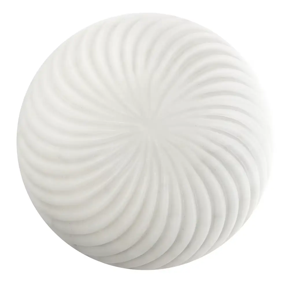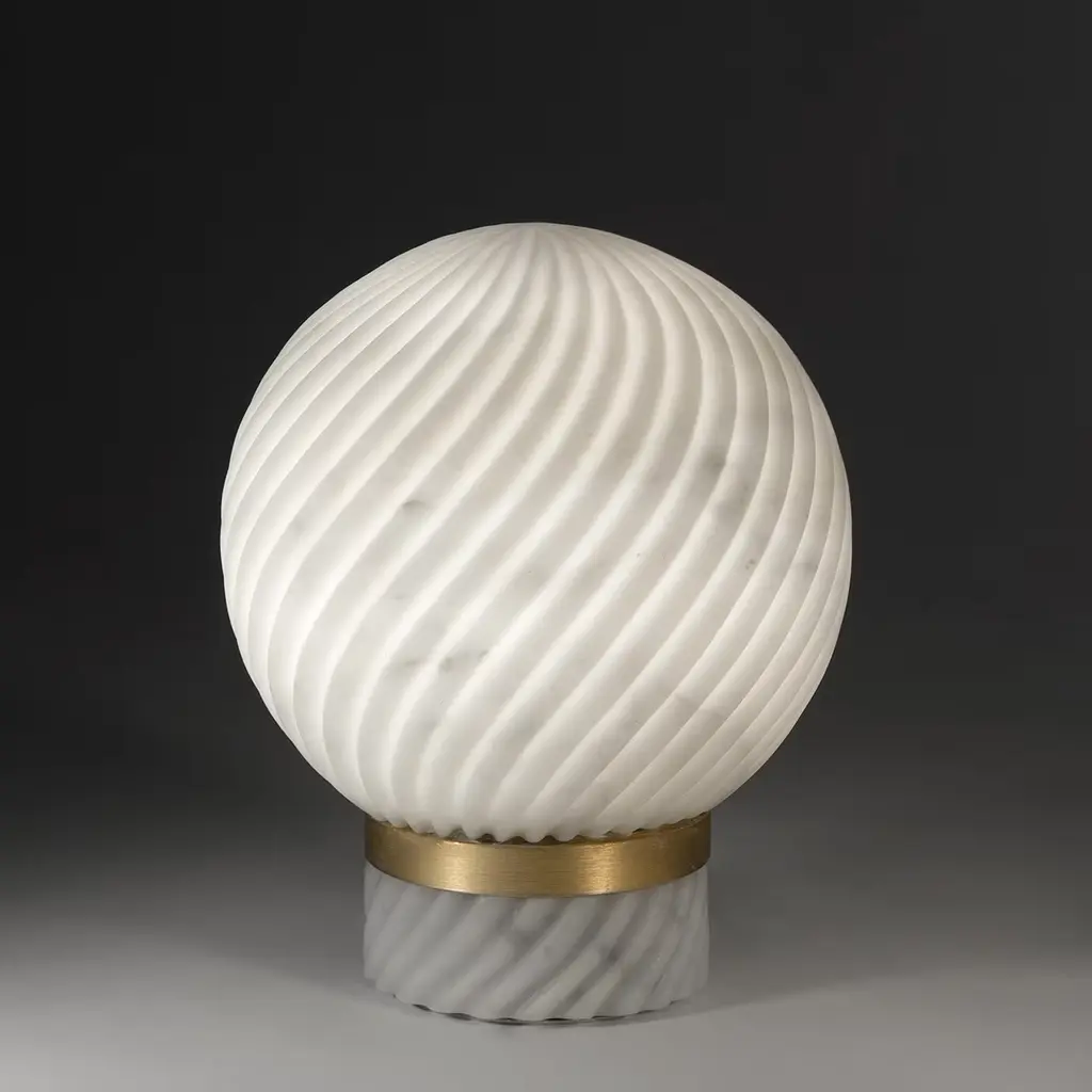 Inspired by pieces from the Victoria & Albert Museum in London, this refined table lamp by Welsh designer Bethan Gray will be a stunning complement to an entryway console, living room side table, or sideboard. Entirely handcrafted by master Italian artisans, the orb-shaped lamp is carved from white Arabescato marble with relief grooves whose sinuous curves and fine edges add a delicate finishing touch to the piece. The lamp is mounted on a cylindrical base in Arabescato marble with a gold-finished brass rim, the color contrast between the stone and metal creating dynamic visual balance.