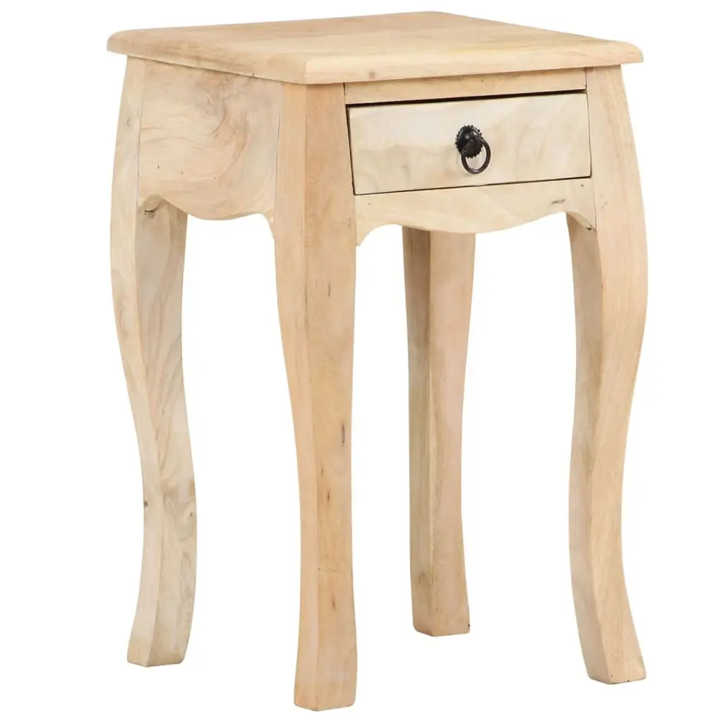 This rustic bedside table is a beautiful addition to any bedroom, blending style and practicality effortlessly. Made from solid mango wood, it has a smooth surface and a classy design, making it perfect next to your bed for lamps, alarms, or personal items. Ample Storage: This bedside table comes with a big drawer, perfect for keeping your night-time essentials close. Whether it's books, glasses, or your nighttime drink, this drawer is both handy and stylish, maximizing your space. Classic Design: With its timeless look, this piece slots right into any bedroom decor, making it a versatile home addition. Its classic style creates a warm and inviting vibe in your personal space. Durable Build: Made from solid mango wood, this bedside table is sturdy and built to last, ensuring its beauty will be enjoyed for years. Its robust design guarantees stability, perfect for daily use. Compact Size: Measuring 11.0 in x 11.0 in x 18.1 in, this compact nightstand is great for smaller spaces, making it ideal for apartments or cozy bedrooms. Its size lets it fit nicely beside your bed without taking up too much room. Versatile Use: This bedside table is also a stylish accent piece for your living room or hallway, adding a touch of elegance wherever it sits.