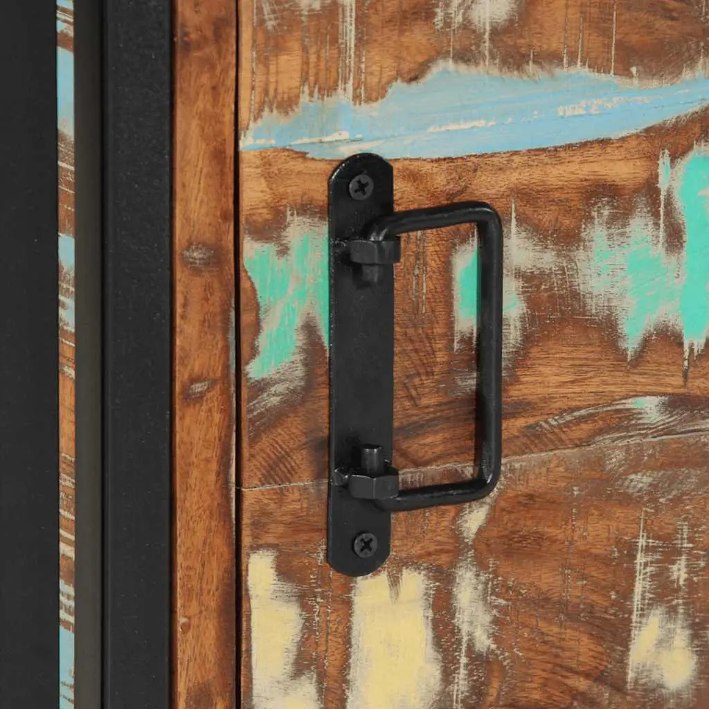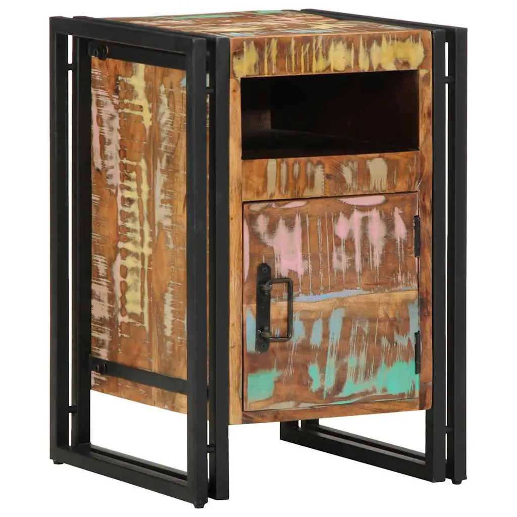 This wooden bedside cabinet with an elegant design makes a timeless addition to your interior decor. Robust and stable: Solid reclaimed wood consists of reused timbers such as teak, mango wood, pinewood, and beech. These materials are recycled from old buildings such as factories, sheds, and boats. Signs of wear and visible grain structure give each piece its own history and a unique look. Ample storage space: The bedside nightstand provides ample storage space for magazines, books, glasses, and other bedtime essentials, keeping them organised and within reach.Stable and long-lasting frame: Iron is strong, stable, and durable, making it an ideal choice for a wide range of applications, from furniture manufacturing to construction. Sturdy top: The sturdy top of the bedside stand is perfect for placing table lamps, alarm clocks, books, picture frames, small potted plants, decorations or other essentials. Practical handle: The handle of the bed cabinet provides a comfortable grip, helping you open and close the cabinet easily while adding extra beauty.Warning:To prevent it from tipping over, this product must be used with the provided wall attachment device.