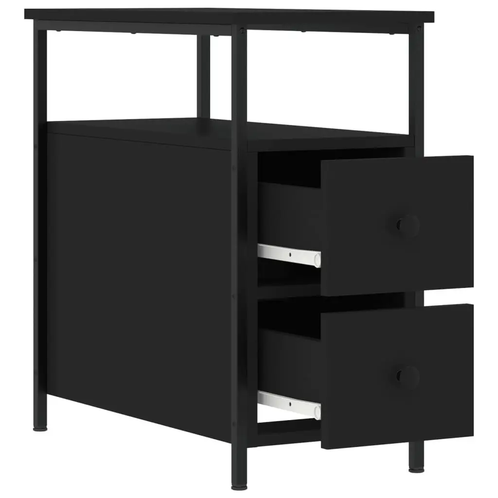 This bedside cabinet nails the balance of style and practicality, fitting perfectly into any modern bedroom or living room vibe. Its sleek matte black finish and tidy lines give it a classy touch, adding real charm to your space. Ideal for keeping your go-to items close, it comes with different storage options, making it a stylish yet smart choice for your room. Ample Storage: The bedside cabinet features two spacious traditional drawers, perfect for storing personal items, books, or gadgets. This smart design helps keep things tidy, letting you maintain a neat and stylish space.Sturdy Construction: Built from high-quality engineered wood with strong iron legs, this cabinet promises lasting durability and stability. The matte finish adds sophistication while protecting the surface from daily wear and tear.Versatile Use: This bedside cabinet is suitable for use in any room, serving as a nightstand in the bedroom or an end table in the living room. A great spot for lamps, alarm clocks, or pretty decorations, it adds to any setting.Compact Design: At 11.8 inches wide, 23.6 inches long, and 23.6 inches high, this cabinet is a fantastic space-saver that fits perfectly in smaller rooms, adding functionality without crowding your decor.Easy Maintenance: Caring for this stylish cabinet is a breeze; just wipe it down with a damp cloth to keep it looking good. Plus, it comes with a wall attachment device for added safety.
