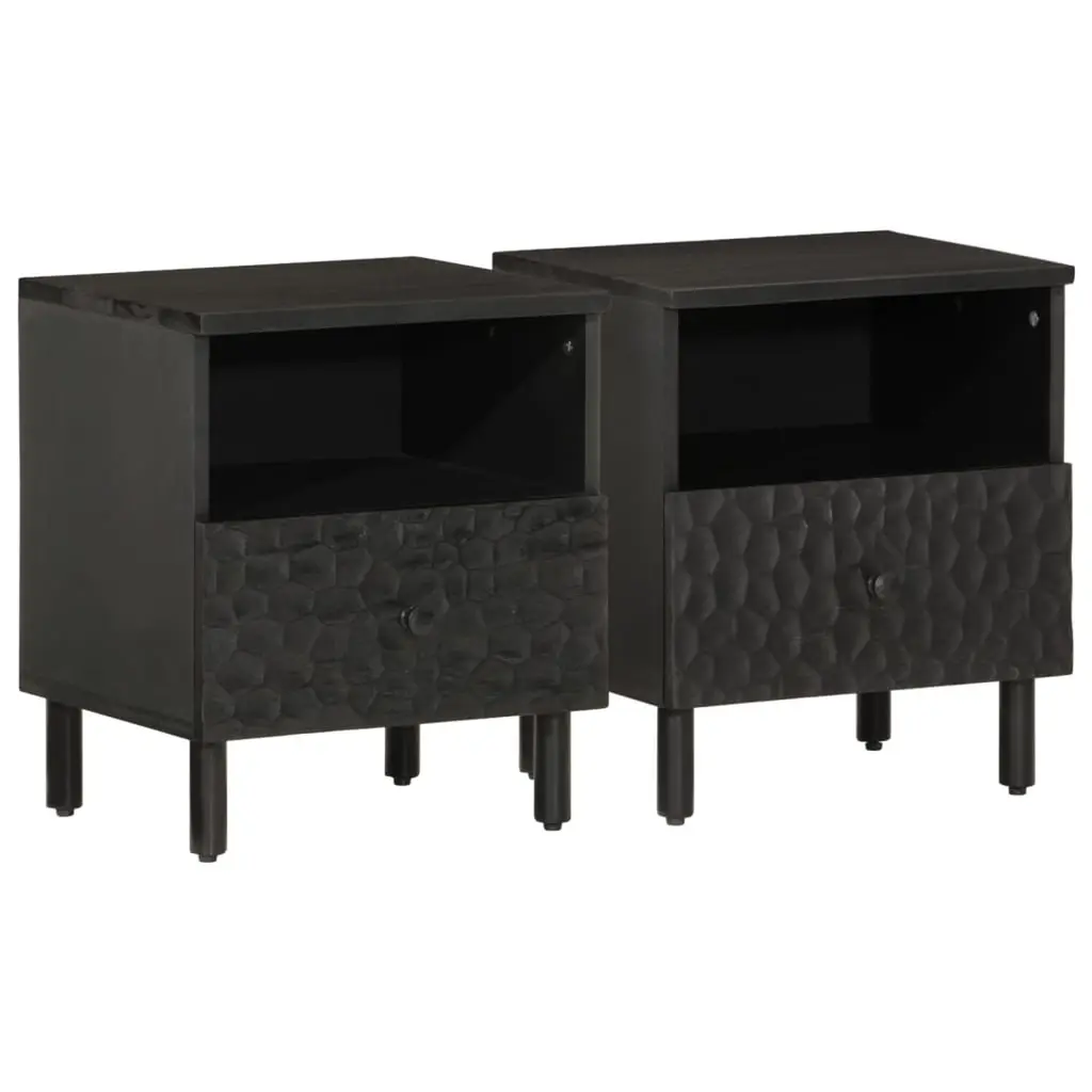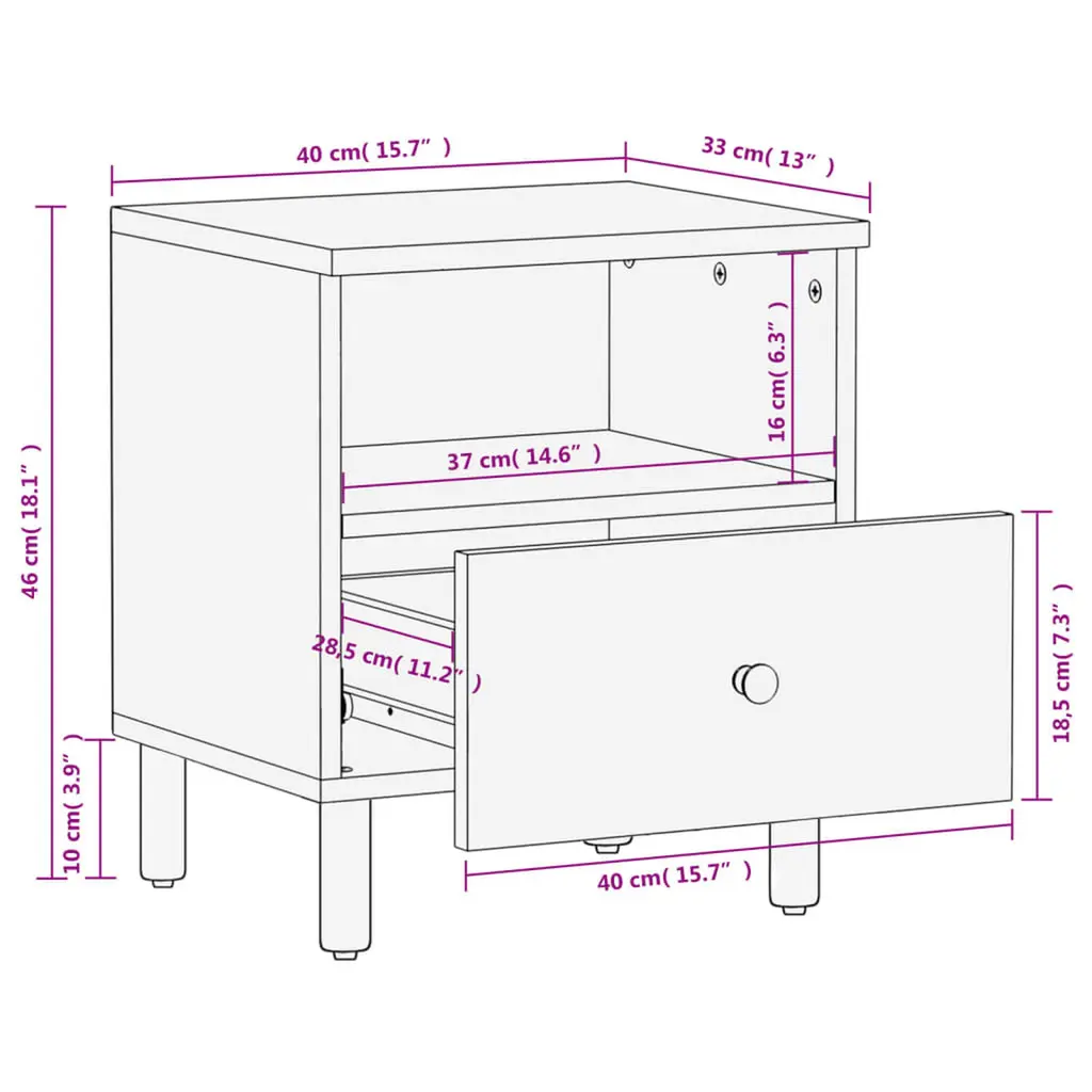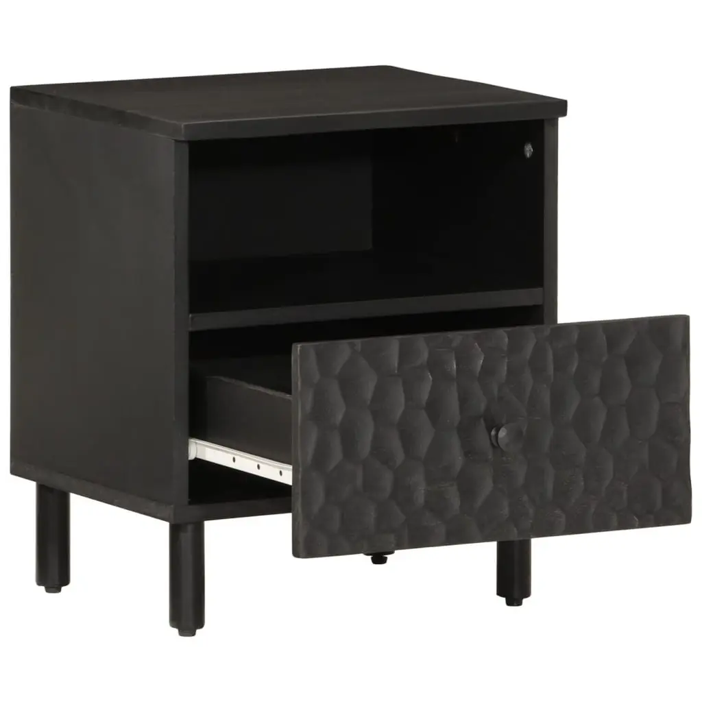 This bedside cabinet is all about contemporary design while being super practical. It's just right for bedrooms and lounges. With its clean lines and smooth black finish, it’s not just a storage solution but also a classy accent piece next to your bed or sofa, perfect for keeping your nighttime essentials close by. Ample Storage: Features a drawer and a spacious shelf, giving you loads of room for books, lamps, and trinkets, keeping everything handy.Modern Design: Aims to spruce up your space; sleek lines and elegant finish give it a refined vibe that matches any style, from minimalist to industrial.Durable Construction: Made from solid mango wood and iron, this cabinet is tough and built to last, making it both a practical and chic choice for any room.Versatile Use: Great for bedrooms, but can also work nicely in living rooms or hallways, serving as an end table or a decorative spot.Compact Size: At 15.7 in long, 13.0 in wide, and 18.1 in tall, this cabinet fits snugly in smaller spaces while still giving you plenty of storage options.