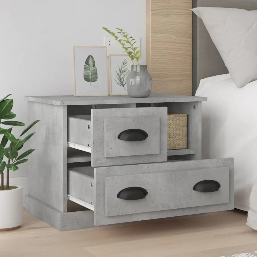 This Bedside Cabinet showcases a modern design with its concrete grey finish and minimalist style, making it a perfect fit for various bedroom looks. Its versatile design isn’t just about looks; it's also really practical, making it an excellent addition for anyone wanting to boost their storage without sacrificing a sleek vibe. 【Ample Storage Space】 With two roomy drawers, it keeps your personal items in check and easy to reach. The built-in shelves add to the charm with space for decorative bits, stepping up your bedroom style.【Quality Construction】 This bedside cabinet is made from durable engineered wood, ensuring it'll last while being easy to care for, sporting a robust and stylish matte finish. The moisture-resistant material helps keep it looking good over time.【Versatile Use】 Perfect for small areas, this piece can serve as a bedside table, nightstand, or even an end table in your living space, fitting nicely into any room.【Thoughtful Design】 The sleek edge pull handles add a minimalist touch that enhances the modern vibe while making it easy to grab drawers nicely.【Ideal Dimensions】 Standing at a height of 17.7 in, with a top measuring 23.6 in long and 15.4 in wide, it’s just right for placing a lamp or clock without cluttering your bedside area.