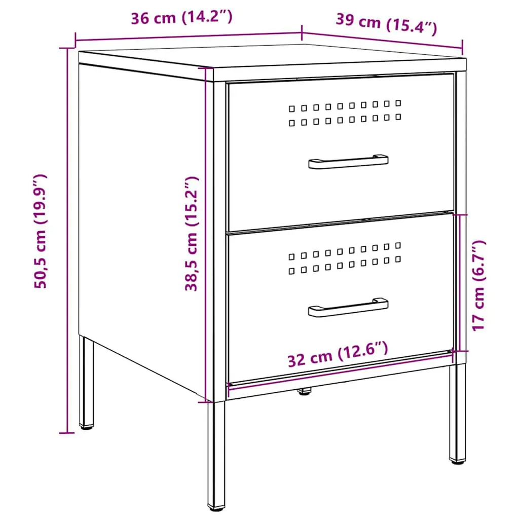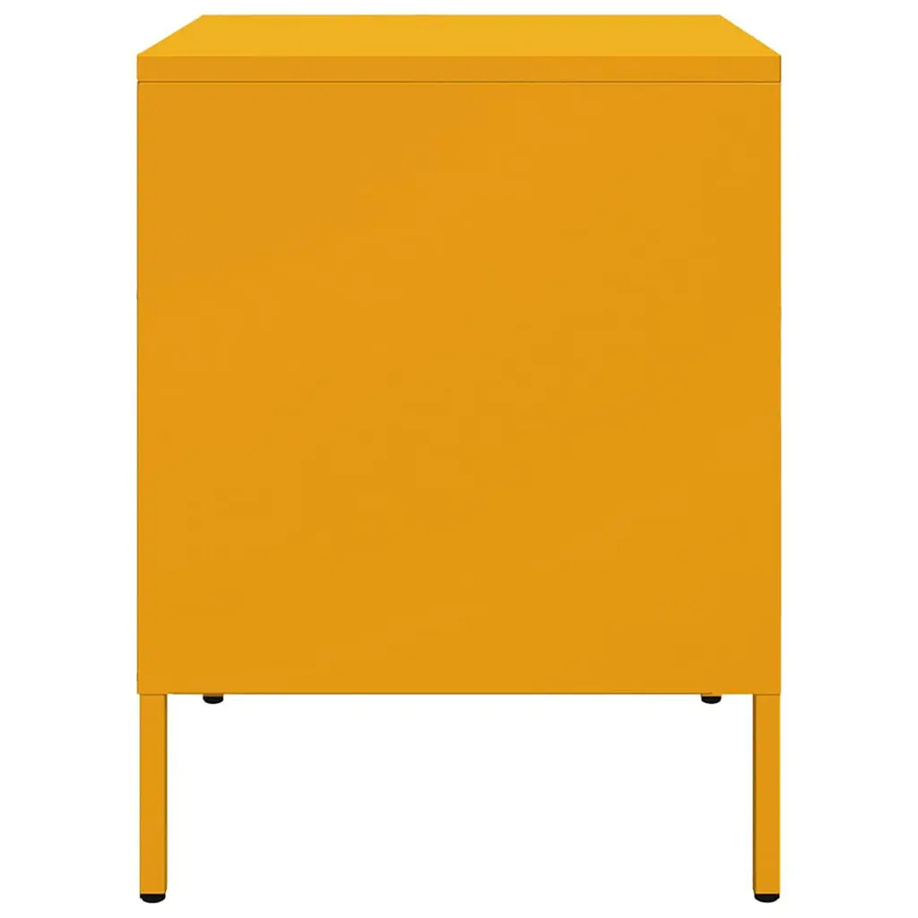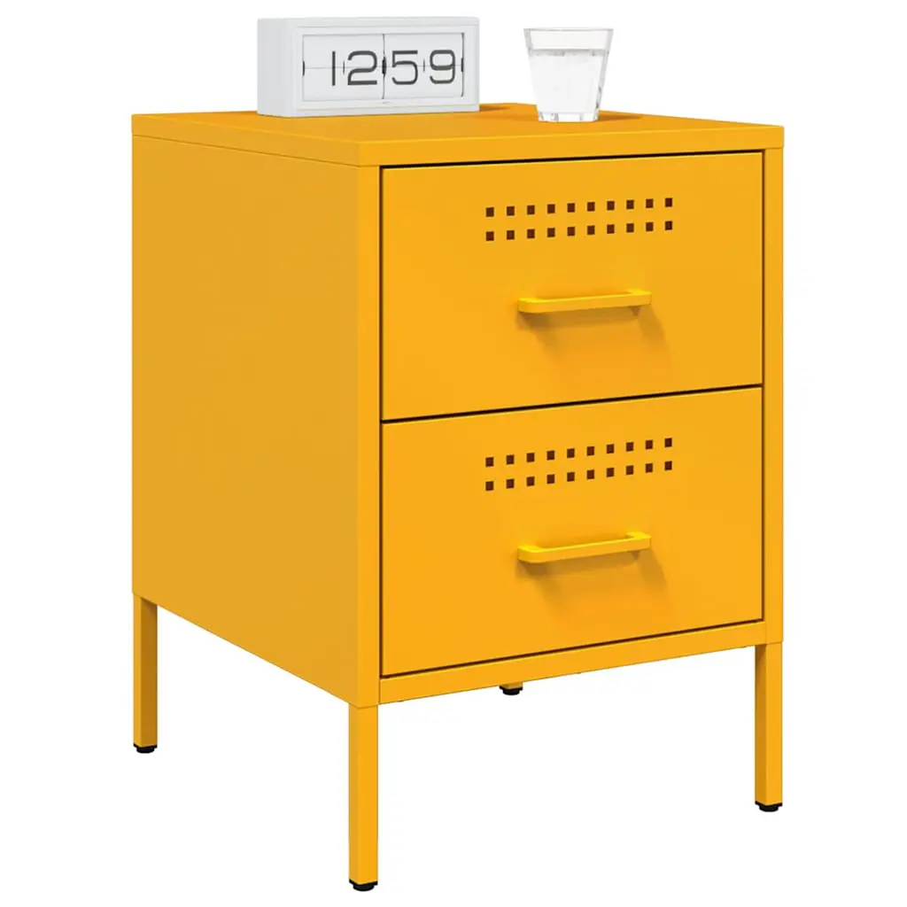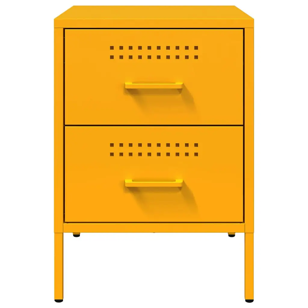 This bedside cabinet adds a striking touch to any bedroom or living area, mixing function with a unique industrial design. Built from sturdy mustard yellow powder-coated steel, it not only provides plenty of storage but also enhances the visual appeal of your decor, making it a perfect buddy for your bed or sofa. The two spacious drawers offer plenty of storage, keeping your nighttime essentials organized for a clutter-free bedside. The durable powder-coated finish resists moisture and wear, making upkeep easy and keeping your cabinet looking great over the years. The bold mustard yellow color adds warmth and brightness, making it a standout piece in any room. It pairs well with various design styles, from modern to eclectic. Thoughtfully designed for functionality, this bedside cabinet can serve multiple roles—from a nightstand for your lamp to stylish storage for books, meeting all your needs at home. With compact dimensions of 14.2 x 15.4 x 19.9 in, it fits snugly in smaller spaces, ideal for urban apartments or cozy bedrooms. The square legs keep it stable while enhancing its visual appeal.