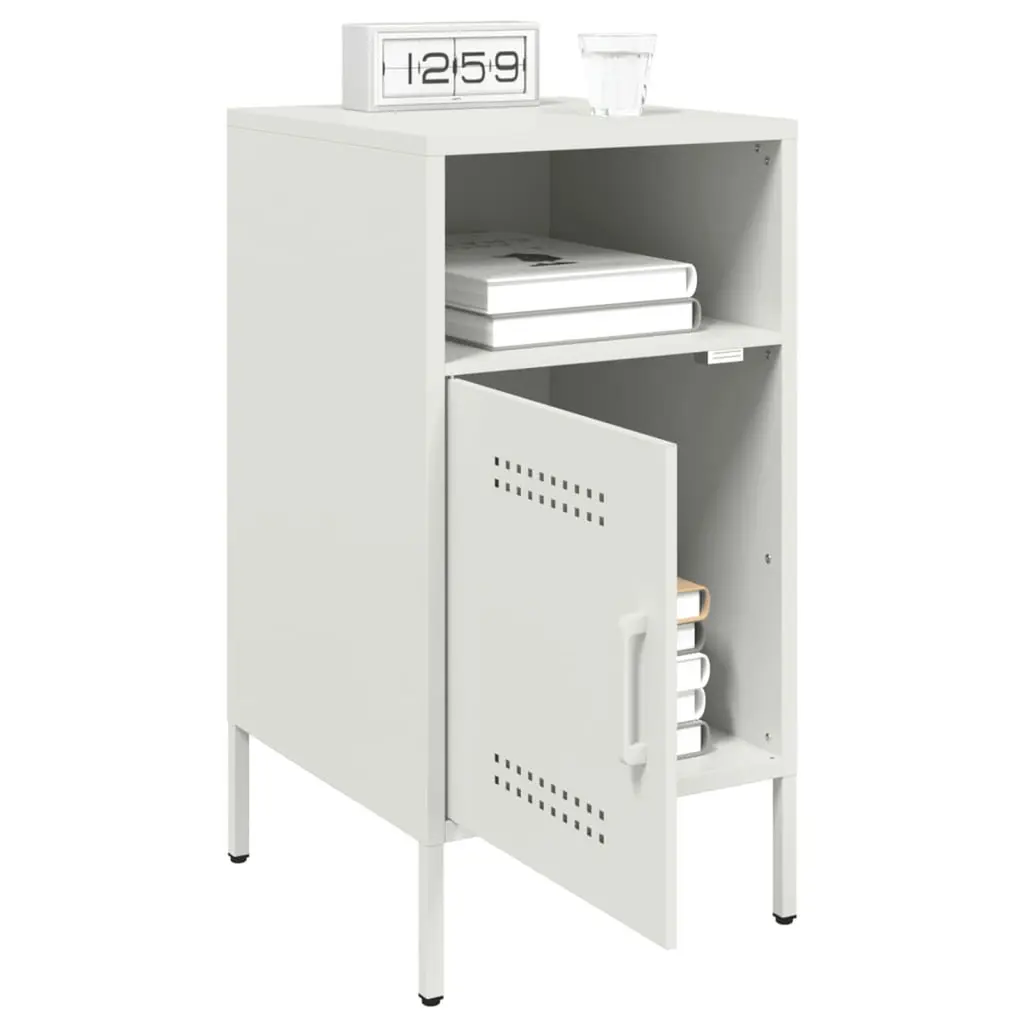 This bedside cabinet is a stylish mix of function and form, boosting your bedroom or living area with its sleek industrial charm. Made from cold-rolled steel with a matte white finish, it fits right in with contemporary decor while providing loads of storage for personal items, making it a smart pick for anyone wanting to optimize their space without compromising on style. Contemporary Design: The industrial style offers a minimalistic yet stylish solution for storing your bedside essentials, creating a polished look that complements modern furnishings.Durable Construction: Built from robust cold-rolled steel, this cabinet is designed to withstand the test of time, ensuring it remains a reliable part of your decor for years to come.Ample Storage Capacity: Featuring a built-in shelf and spacious top surface, this cabinet provides plenty of room to house books, night lamps, or decorative items, keeping your space tidy and organized.Adjustable Feet: The adjustable feet let you tweak the height for uneven surfaces, providing stability and versatility in any room of the house.Compact Design: With dimensions of 15.4x14.2x26.8 in, it offers storage without taking up too much space, making it ideal for smaller rooms or apartments.