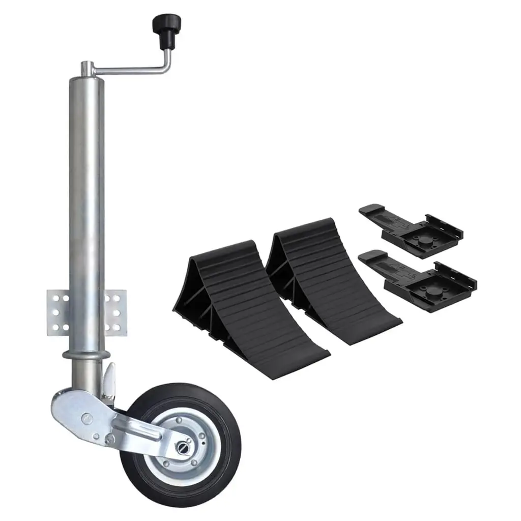 This jockey wheel contains the necessary accessories to ensure the proper parking of your trailer and increase your safety when loading and unloading.Jockey wheel: Made of high-quality galvanised steel, this jockey wheel is robust with a maximum load bearing capacity of 330.7 lb, which makes it suitable for use with small to medium trailers and caravans. The solid rubber wheel helps to easily move around your trailer when the jockey wheel is attached.Stable support tubes: These support tubes are made of high-quality galvanised steel which is robust. They are used for added stability to ensure safe and reliable support for your trailer.Practical split clamp: The split clamp is equipped with a rubber grip on the end of the handle for easier manoeuvring. Simply screw clockwise or anti-clockwise to open or close the clamp. It is easy to open for quick removal of prop stands and jockey wheels, making your setup and dismantling process smooth and efficient.Wheel chocks: The clever design of these wheel chocks helps the wheel blocker slot into an angle with great ease. Also, the ribbed top surface allows wheels to grip on for a prolonged time, which allows you to keep the car stable for ultimate safety.