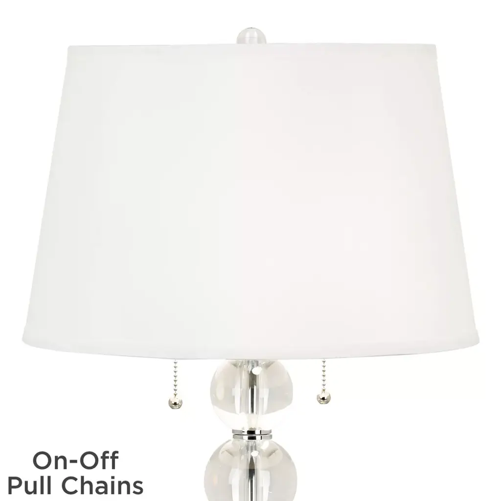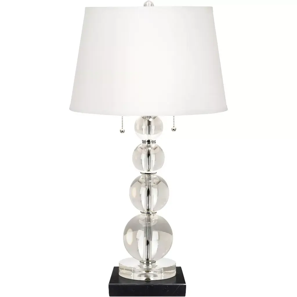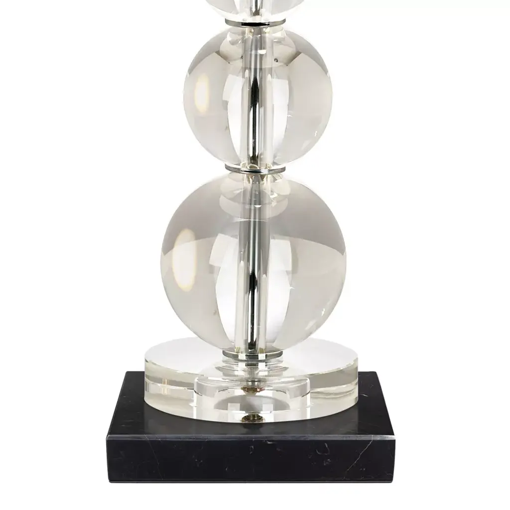 Stacked crystal globes provide an alluring profile on this modern lamp design from the Vienna Full Spectrum brand of lighting. The crystal glass spheres get smaller as they reach upwards, and at the very top of the design is a tapered drum lamp shade in a white fabric. Twin chain pulls and a ball finial finish add to the look of sophistication. The lamp also comes with a real black marble riser that can be used to give the design extra height and style.