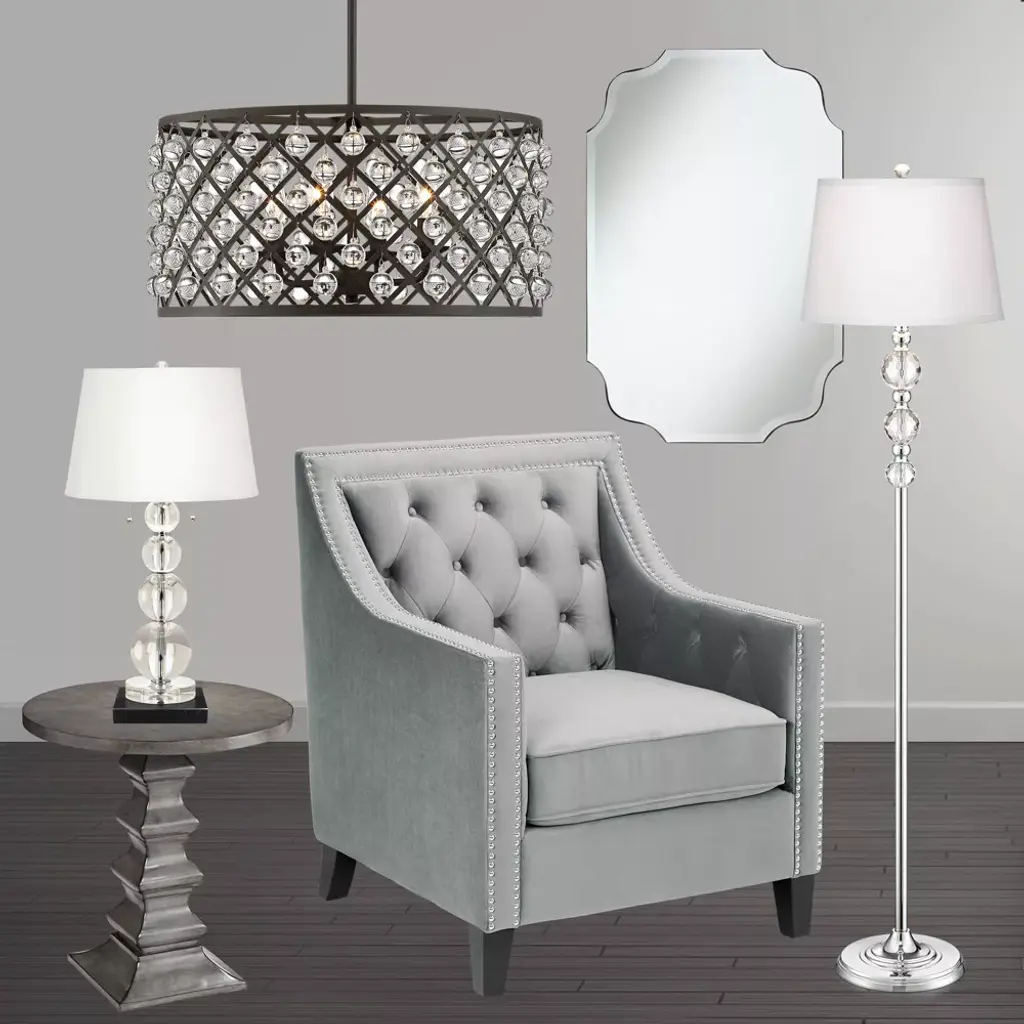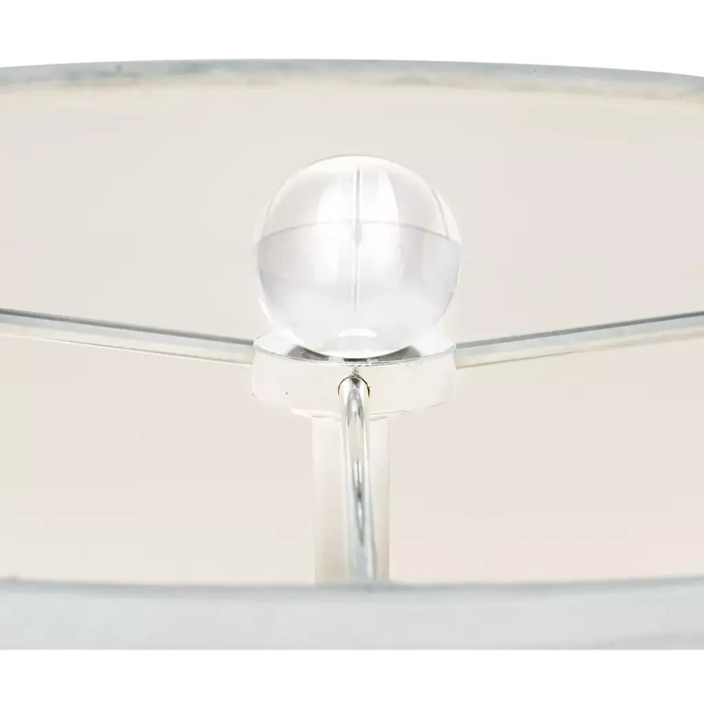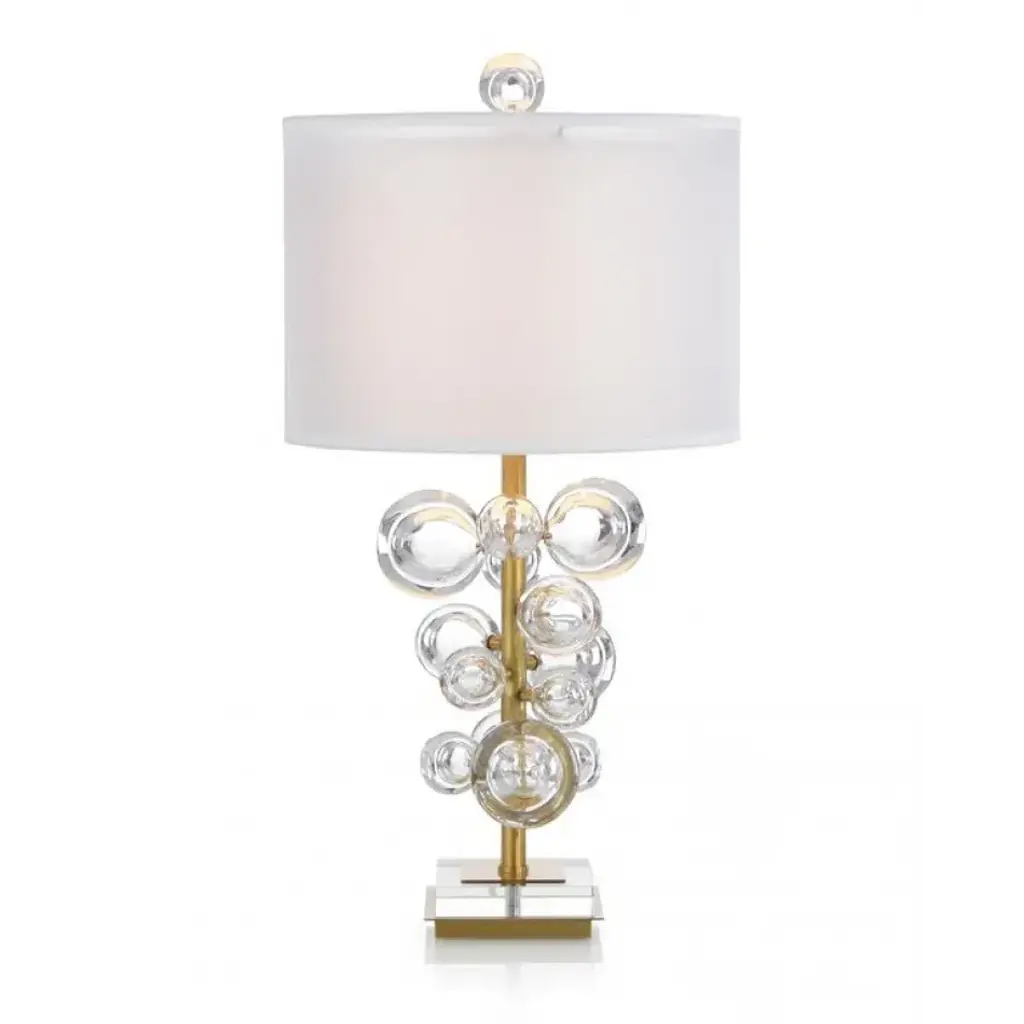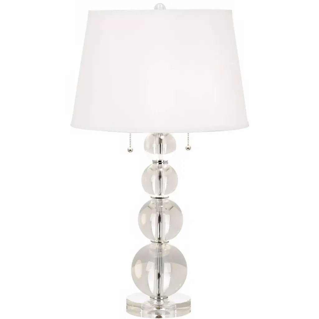 Stacked crystal globes provide an alluring profile on this modern lamp design from the Vienna Full Spectrum brand of lighting. The crystal glass spheres get smaller as they reach upwards, and at the very top of the design is a tapered drum lamp shade in a white fabric. Twin chain pulls and a ball finial finish add to the look of sophistication. The lamp also comes with a real black marble riser that can be used to give the design extra height and style.