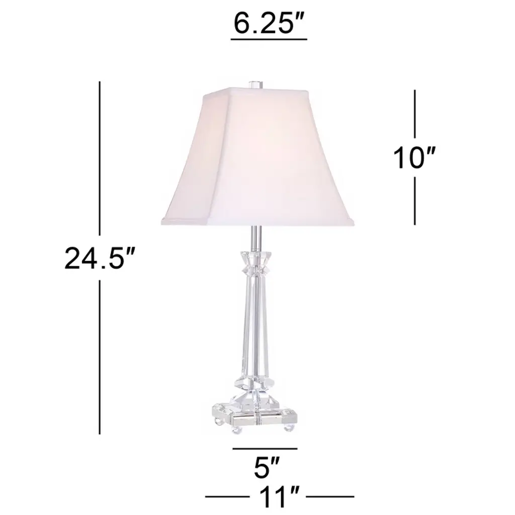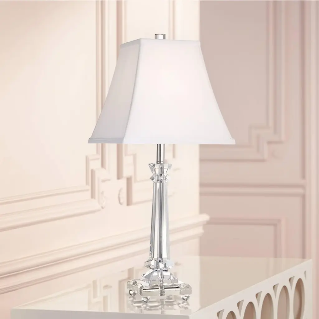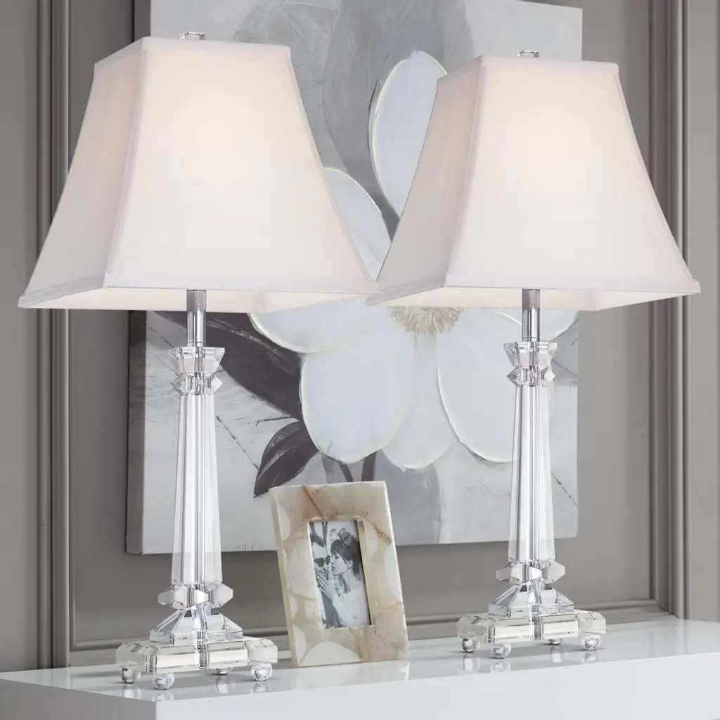 Inspired by artistry with a gleaming lightness, this set of two modern table lamps from the Vienna Full Spectrum brand of lighting updates any living space. Each lamp design features a transparent crystal glass base with an elegantly tapered column shape. Bell shades balance profiles and extend the radiant impact of lamps created to impress.