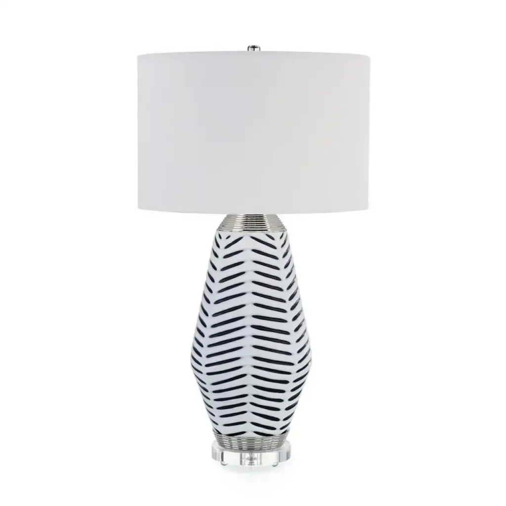 The Vienna Table Lamp is a stunning contemporary design that elevates an interior space with refined tones and rich textural depth. This white glass lamp shows a masterful use of negative space with an array of slender openings, subtly arranged in a segmented chevron pattern. The piece features a round acrylic base, as well as a ringed aluminum accent in Nickel that matches the base accent and short peg finial. A white drum shade complements the body to complete the look.