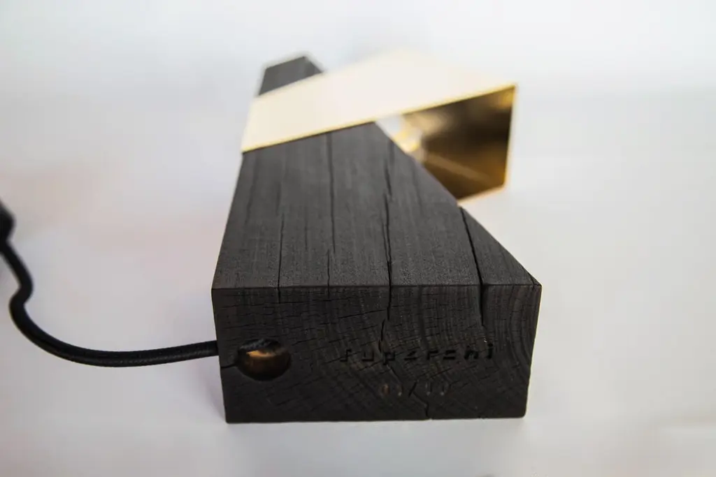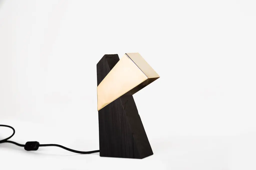 Viga table lamp by Caio SuperchiLimited edition of 10Dimensions: D15 x W7 x H28 cm Materials: metal, woodAll our lamps can be wired according to each country. If sold to the USA it will be wired for the USA for instance.Repurposed from demolition wood beams belonging to buildings from the early twentieth century, a minimalist lighting fixture: "VIGA" Its metal dome has a trapezoidal shape that floats over the wooden base, which has built-in magnets, and can be adjusted vertically, generating direct or indirect light, depending on its positioning. It ´s the perfect ambient light. In this special series with signed and limited edition of 10/10 we used the Japanese technique Shou Sugi Ban to seal the wood called "Peroba do Campo" and its metal dome is gold plated, the perfect match between carbonized wood and metal.Caio Superchi is an artist and craftsman born in Rio de Janeiro, Brazil, who discovered woodworking at the age of 22 as well as the purpose of his work:Designing forms that exalt function using light, repurposed wood and other materials. An interpretation on the meaning of transformation. Growing up, he was influenced by his father to think about the function of objects and to see beyond that, to see what other things they could become. When he started as an apprentice in a woodworking shop, he found wood to be the perfect material to bring his ideas to life. After starting the Superchi Studio as a means to unite what he learned with what he imagined, the pieces created by the studio have been shown in several exhibitions in Latin America and Europe, the continent that welcomed him when he decided to transform and rethink himself in another city: Lisbon, Portugal.That is where he is currently based and produces all the pieces. In this new stage of his life, Caio worked and perfected traditional woodworking techniques while making and restoring classic furniture. This has now allowed him to concentrate on lamp making and explore new concepts and ideas. Nothing is created from nothing. Transformation is the central idea and goal behind the Studio pieces. The rethinking and repurposing of form and function allows us to see this process, while maintaining the object's and materials original story.