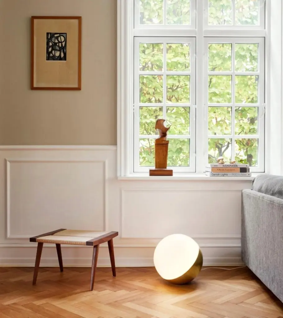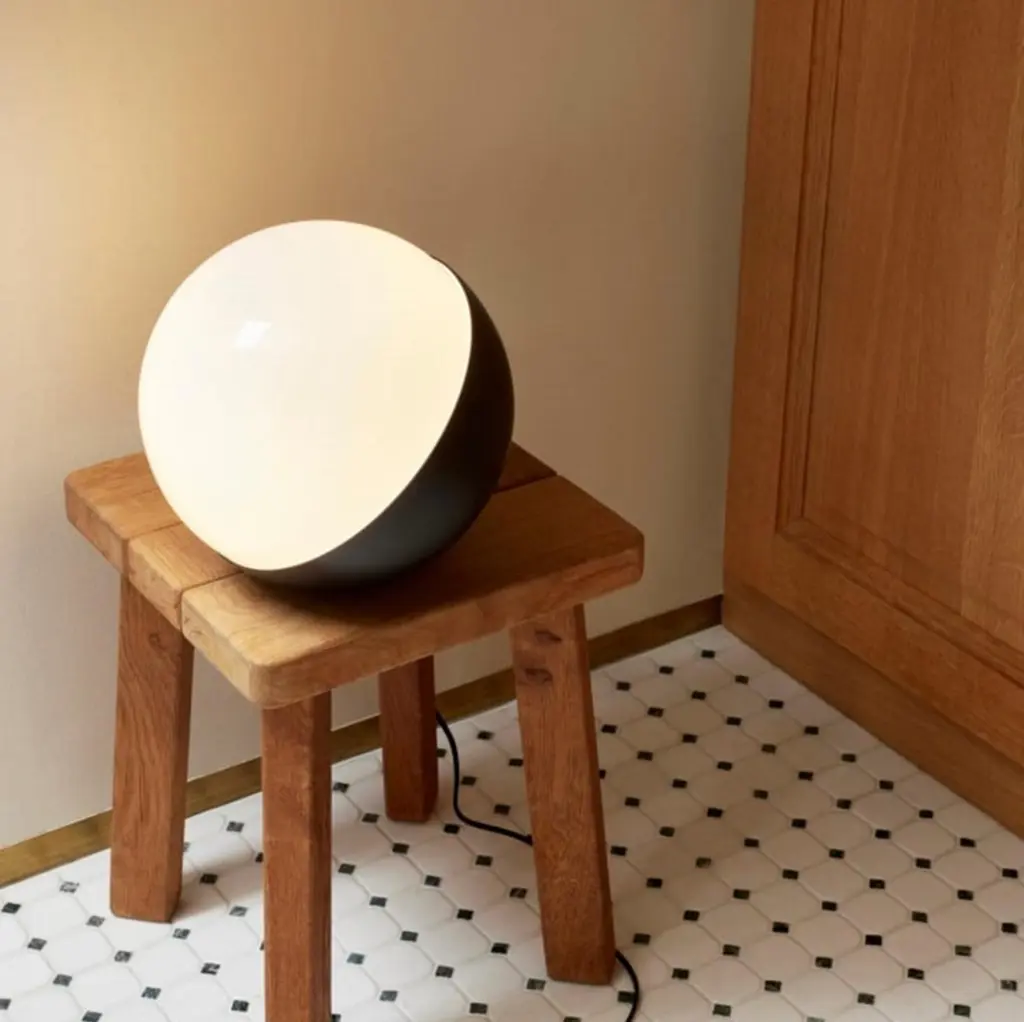 Vilhelm Lauritzen 'VL Studio' floor or table lamp in brass for Louis Poulsen. Designed in the 1940s. New, current production.The VL Studio family derives from a lamp designed by architect Vilhelm Lauritzen for Radiohuset (The Radio House, headquarters of the Danish Broadcasting Corporation) in Copenhagen in the 1940s. The name ‘Studio’ was chosen because some of the lamps were used outside the studio to indicate – with either a red or green light – whether recording was taking place. Vilhelm Lauritzen was the architect behind Radiohuset, which was inaugurated in his functionalist design in 1945. Radiohuset is a ‘gesamtkunstwerk’ – like most of Lauritzen’s buildings – meaning that he designed all the interiors and every detail of the building for the project. When developing Radiohuset, Lauritzen designed a broad collection of lamps in close collaboration with Louis Poulsen. For this project, Lauritzen created the Studio lamp, the VL 38 Table lamp (VL38), the Radiohus Pendant (VL45) and the VL Ring Crown lamps. After the creation of the lamps in the 1940s, they were produced by Louis Poulsen. However, over the years, they were all taken out of production. The VL45 (Radiohus Pendant) and the VL38 (Table lamp originally from the interior of the building) were reintroduced in 2016, the VL Ring Crown in 2019, and most recently the VL Studio lamp in 2022. The VL Studio lamp is closely related to the Radiohus Pendant; both create a diffused light through opaline glass which provides a pleasant general light around the lamp. Based on the design and materials of the lamp head from the original wall lamp, the VL Studio Table/Floor lamp was introduced in 2022. It is made of polished brass that is slightly brushed with glossy white, triple-layered, mouth-blown opal glass. The VL Studio Table/Floor lamp also comes in a matt black version for a more graphical, clean expression compared to the soft, warm look of the polished brass version. The table lamp series is available in three sizes that can be positioned on the ground as floor lamps or as table lamps as required. The small size Ø150 has the same diameter as the original VL Studio Wall lamp and can easily be placed anywhere, the middle size Ø250 is perfect as a table lamp and the larger version Ø320 is ideal for both table and floor use. The VL Studio Table/Floor lamp brings a modern touch and warm ambience to any interior with its simple aesthetic and exquisite materials.This listing is for the VL Studio in brass. Also available in black.