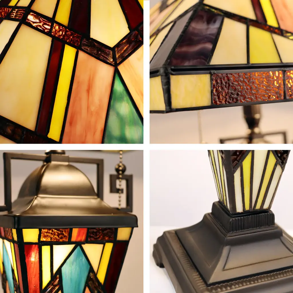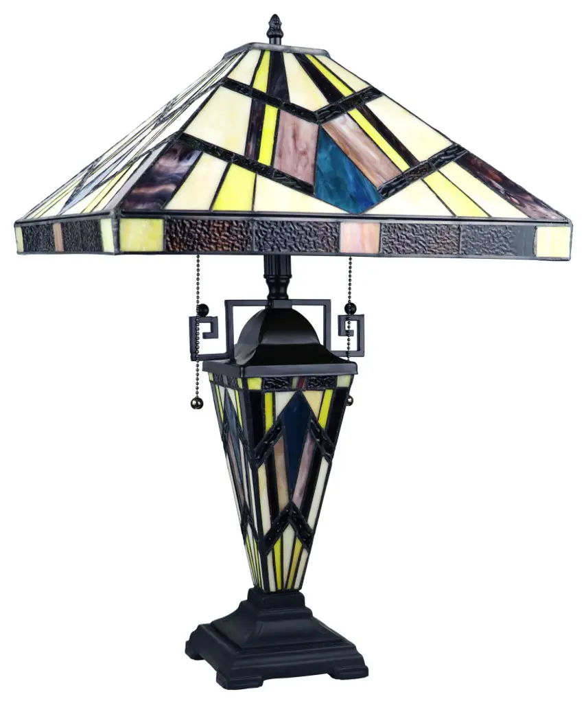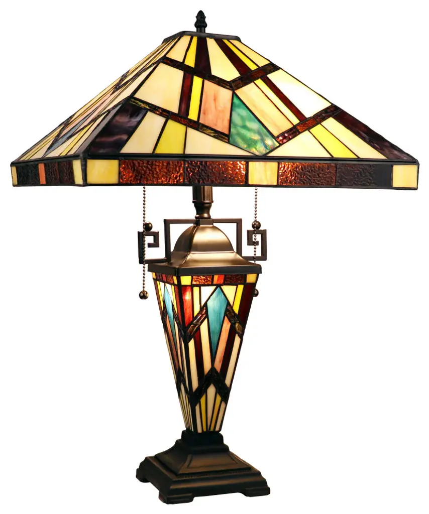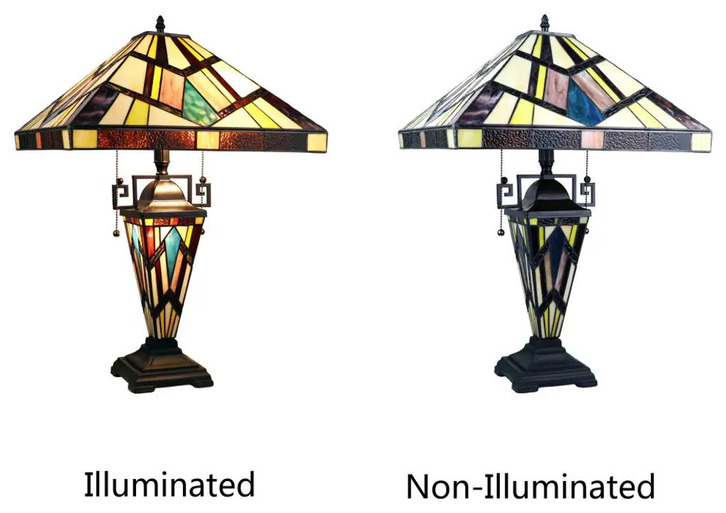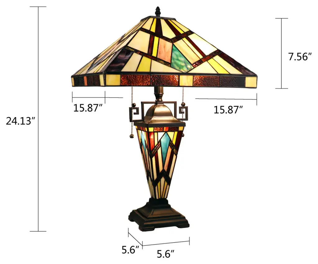 Vincent is a beautiful, stained glass double-lit table lamp in a traditional Mission style, featuring a stained glass base, 2 pull chains, and an on-cord rotary switch. This lamp would be perfect in a bedroom, living room, and dining room. The shade is hand-crafted, using the same methods developed by Louis Comfort Tiffany in the early 1900''s. This process entails using 256 hand cut stained art glass pieces, each wrapped in fine copper foil and soldered together at extremely high temperatures to form each unique piece. Exact size to the nearest inch may vary, and exact color of each glass piece may vary due to each piece being hand crafted. First image is with the light shining through, second image is with no light. Dry listed and recommended for an indoor setting.